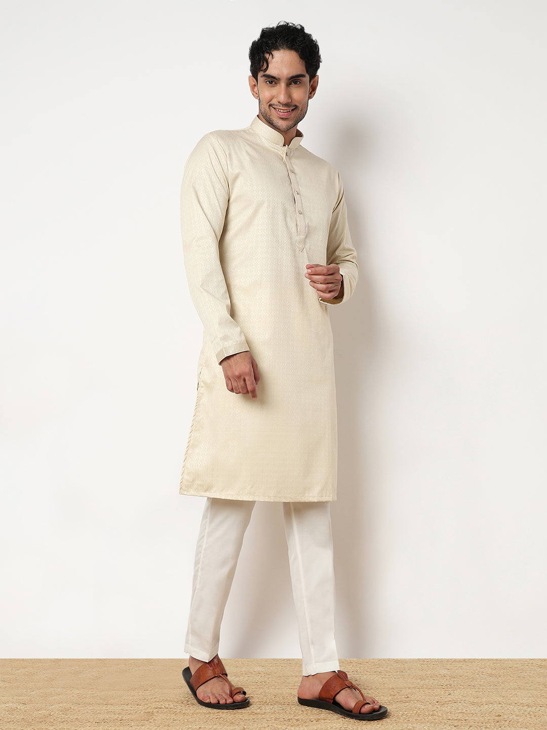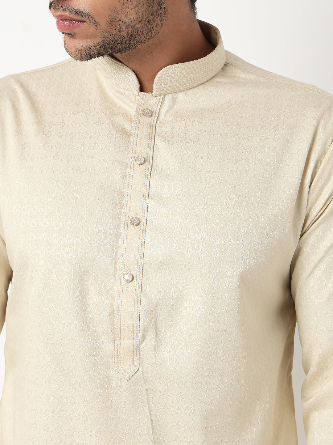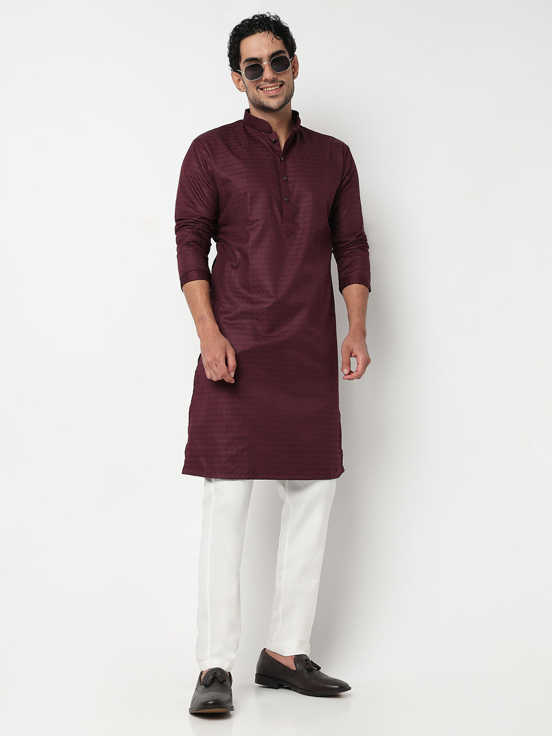 This jacquard pattern kurta with pant set has a mandarin collar and full sleeve. Made from cotton dobby, it is soft and comfortable to wear.