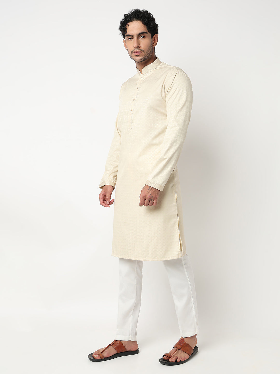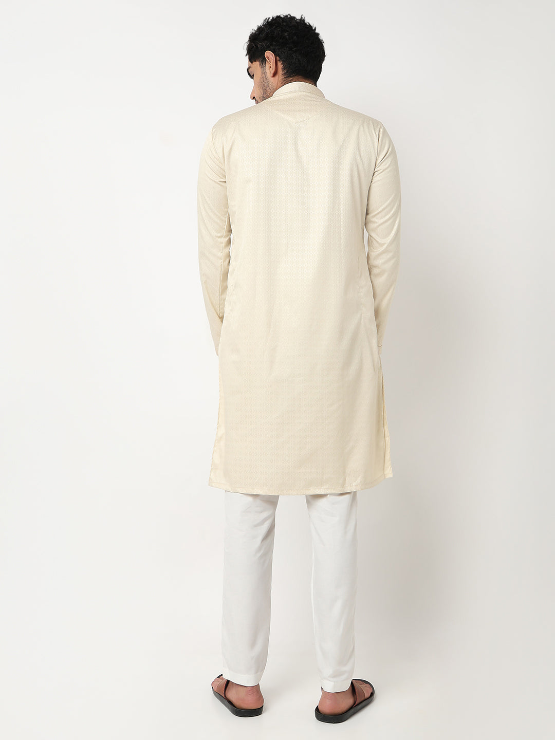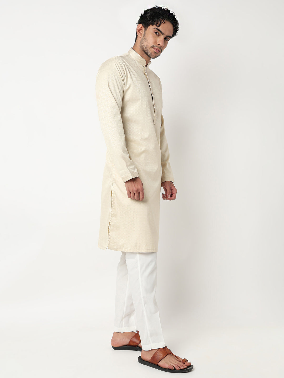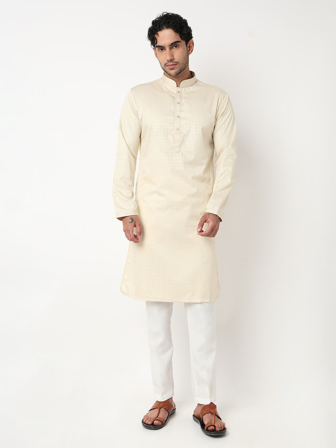 This jacquard pattern kurta with pant set has a mandarin collar and full sleeve. Made from cotton dobby, it is soft and comfortable to wear.