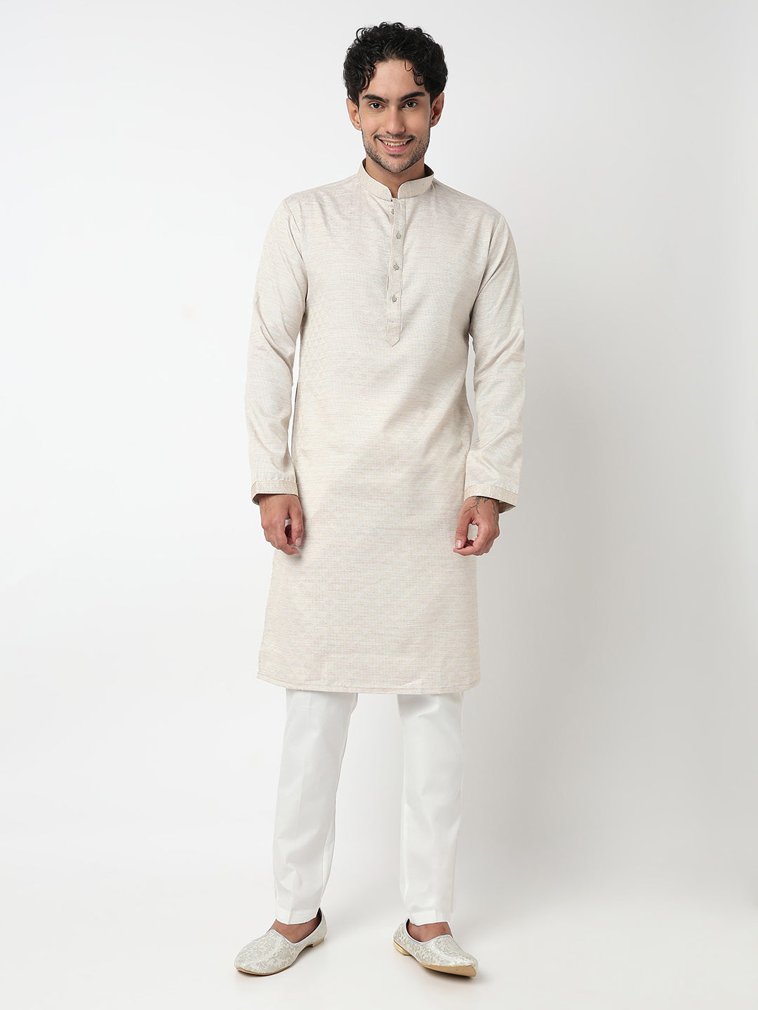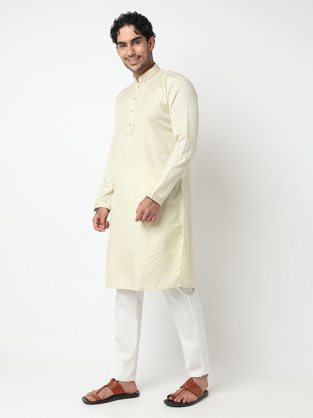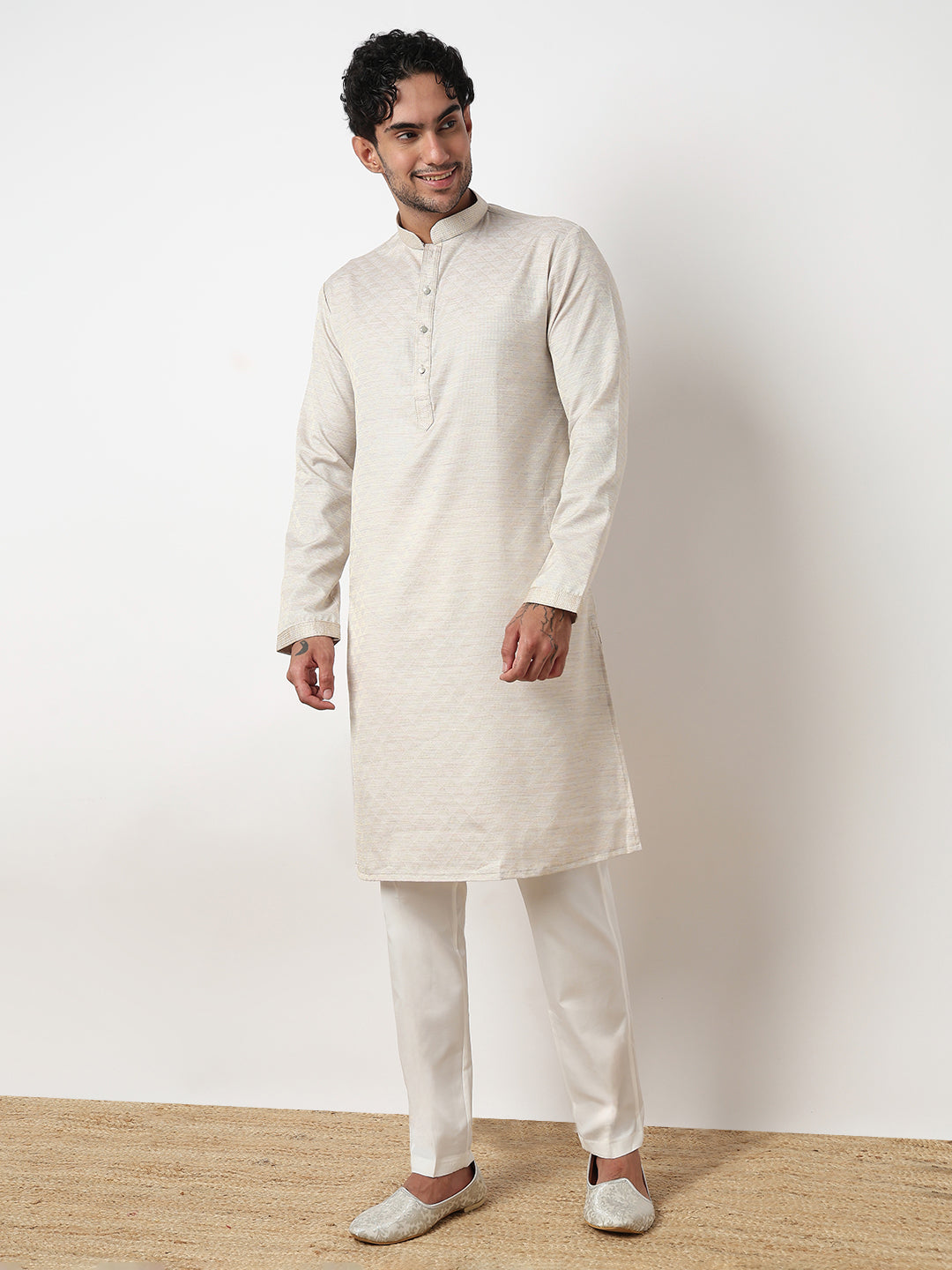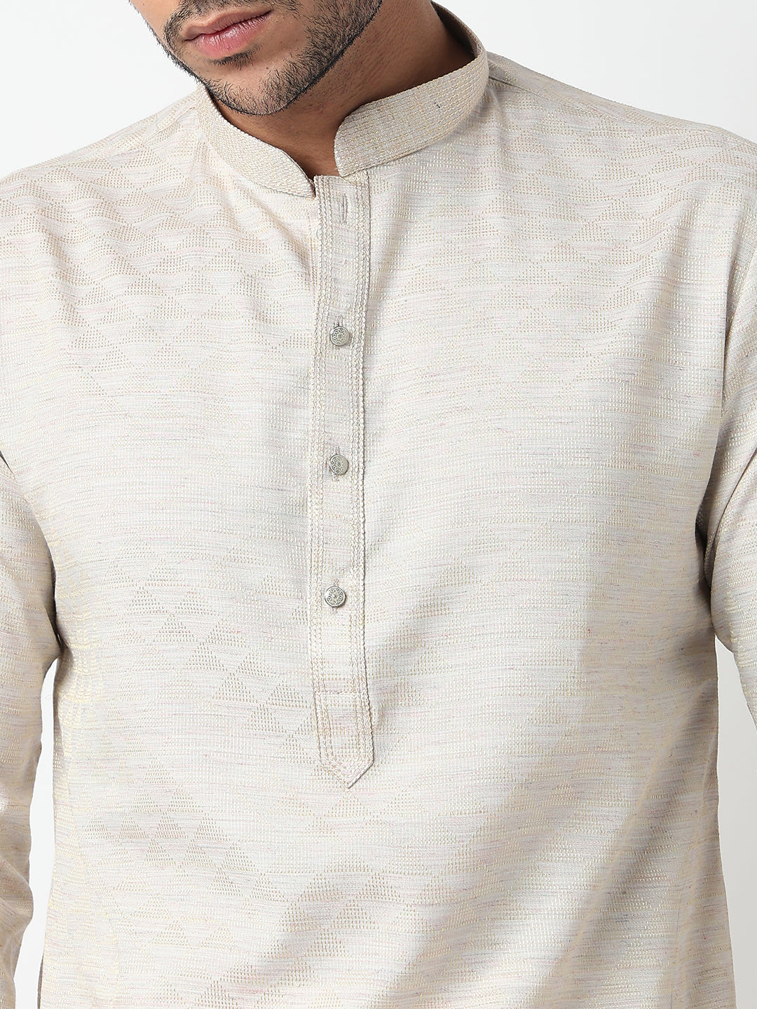 This jacquard pattern kurta with pant set has a mandarin collar and full sleeve. Made from viscose dobby, it is soft and comfortable to wear.