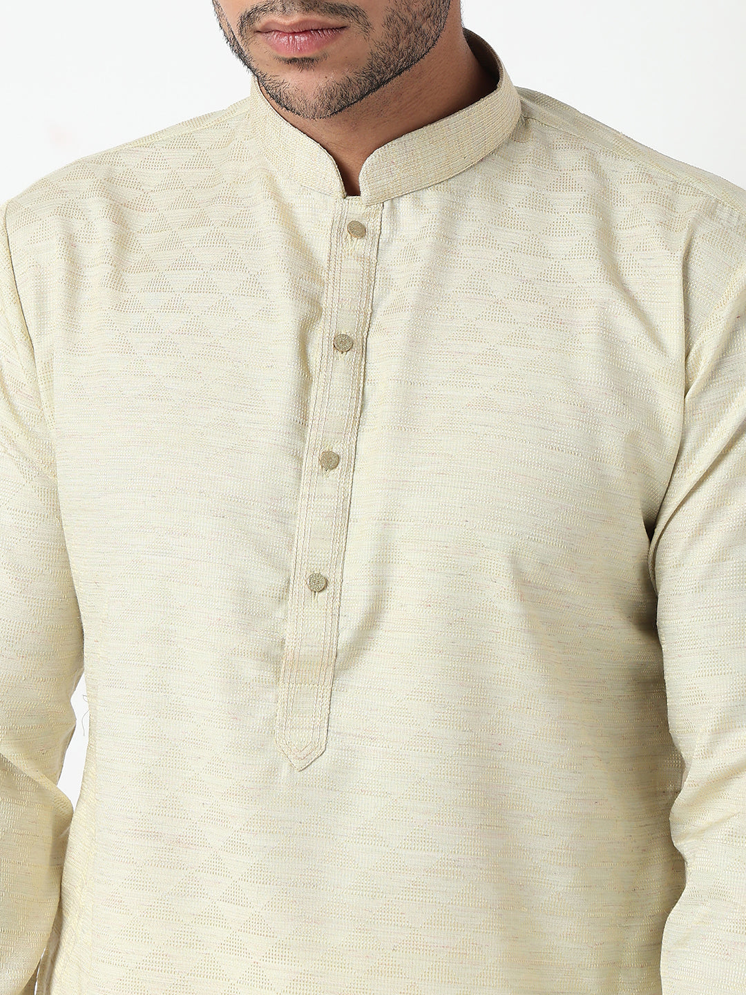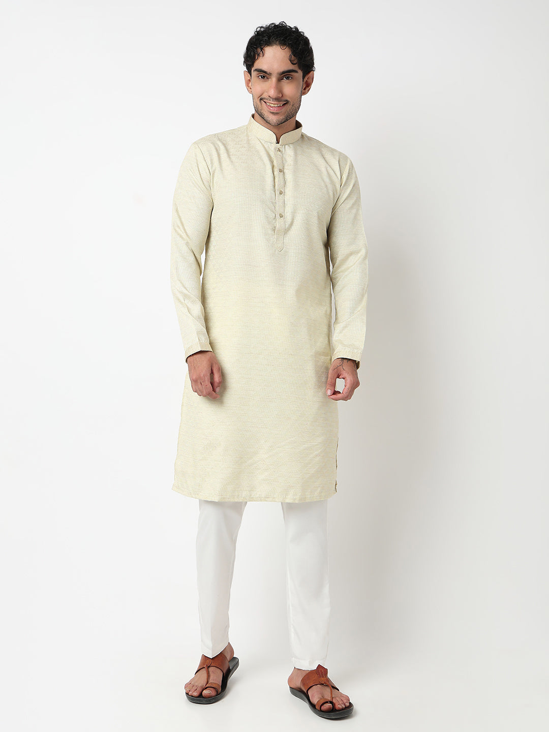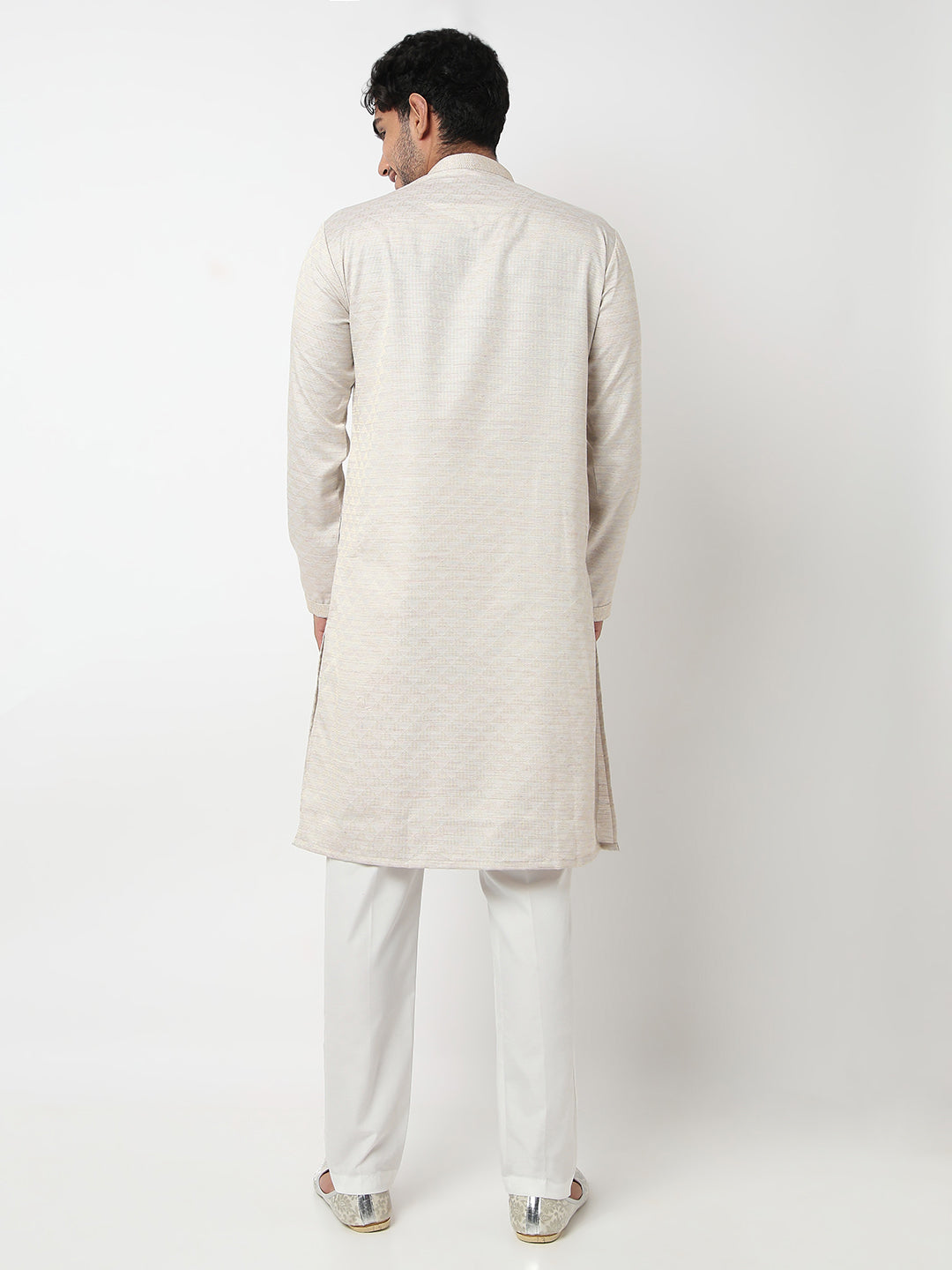 This jacquard pattern kurta with pant set has a mandarin collar and full sleeve. Made from viscose dobby, it is soft and comfortable to wear.