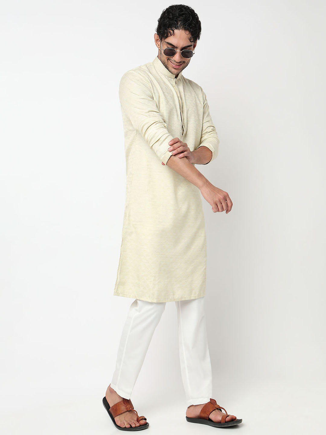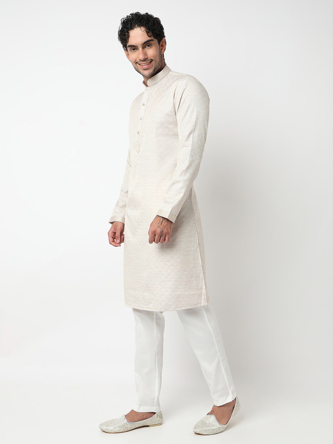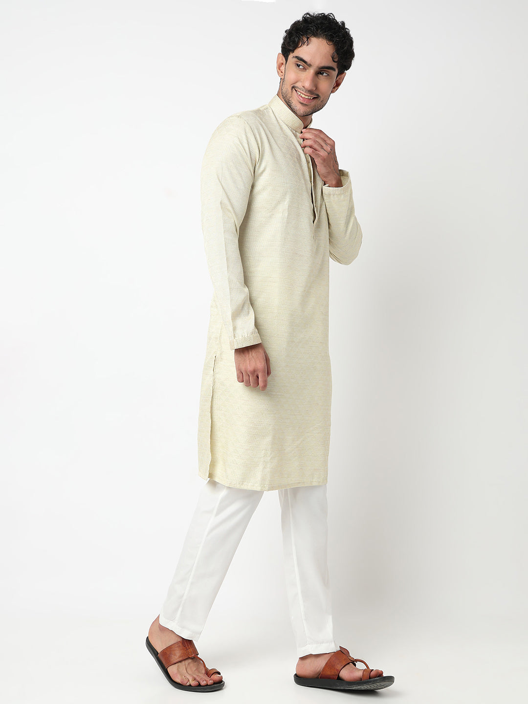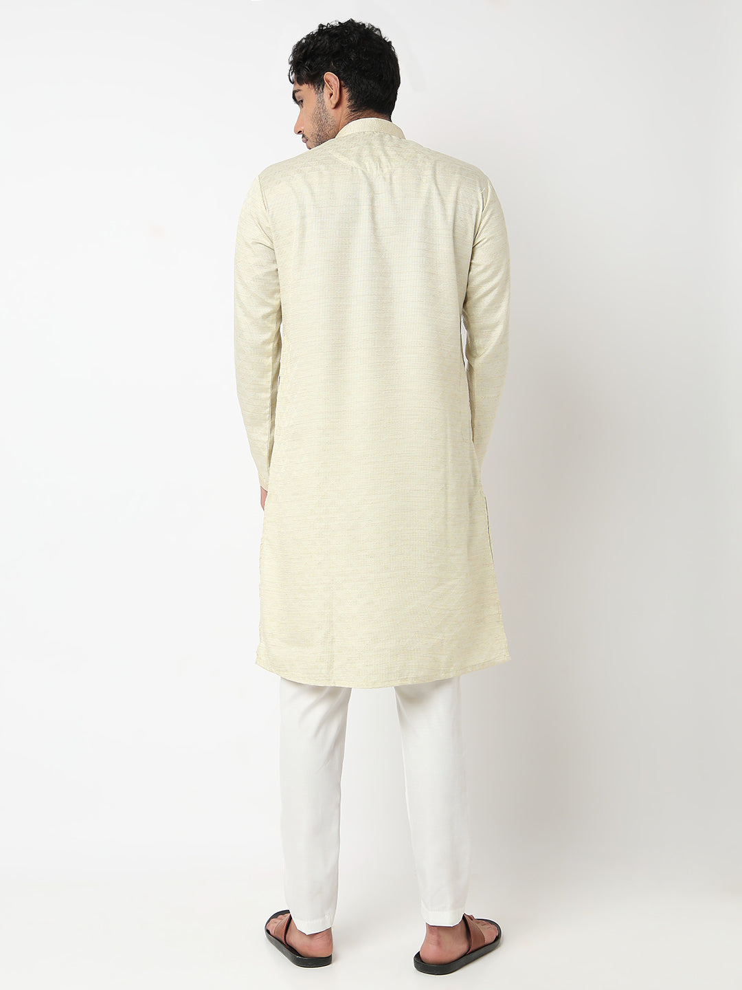 This jacquard pattern kurta with pant set has a mandarin collar and full sleeve. Made from viscose dobby, it is soft and comfortable to wear.