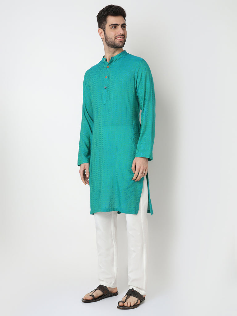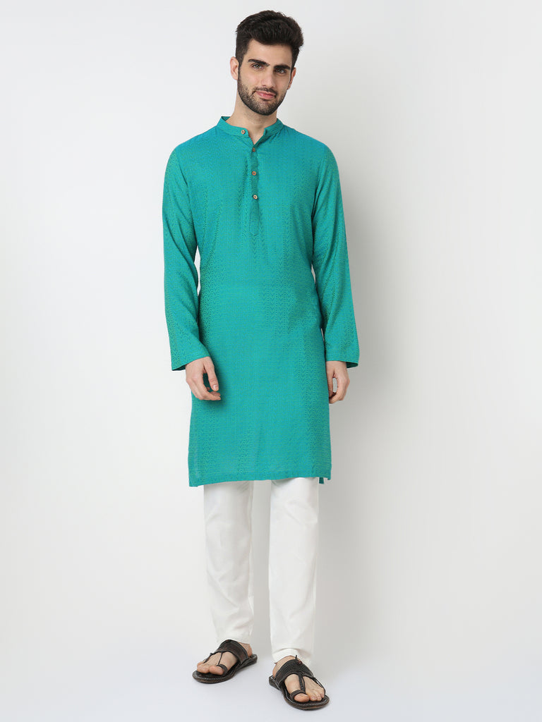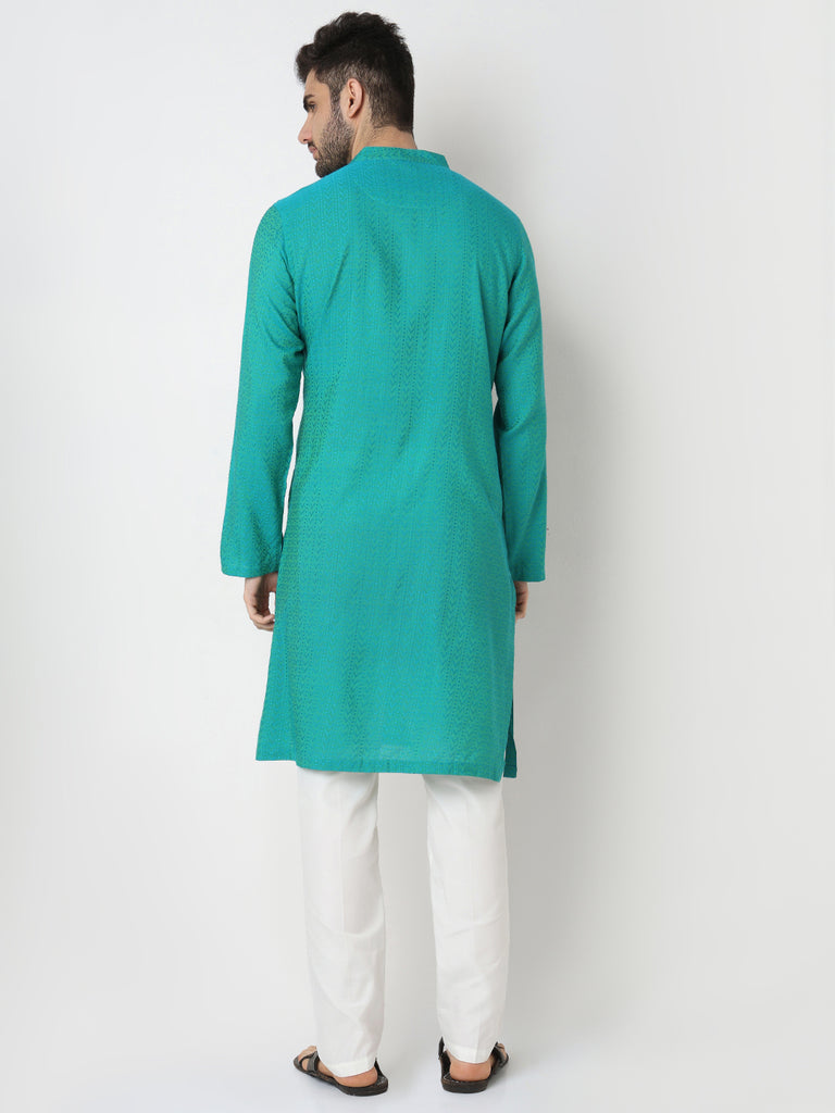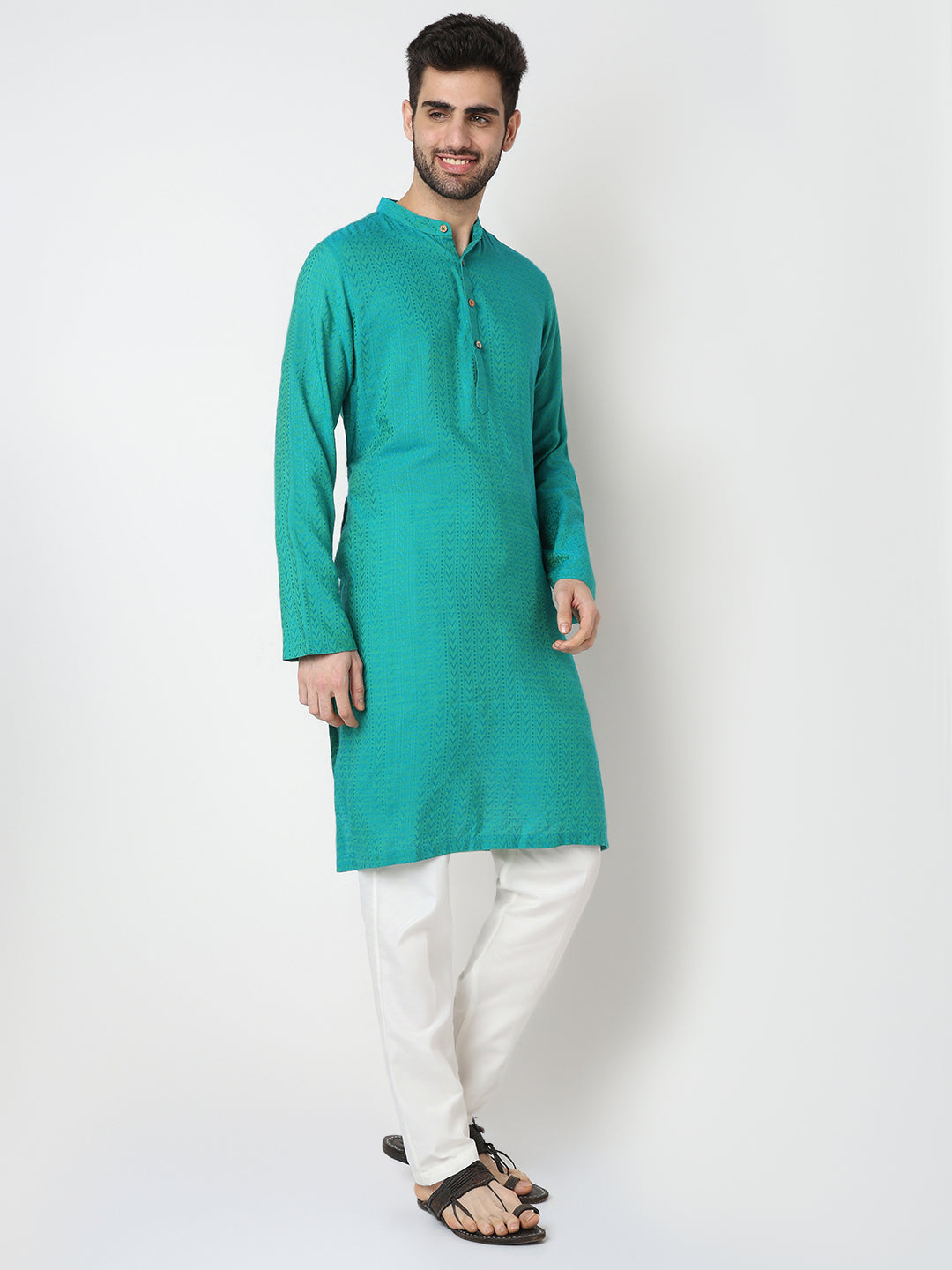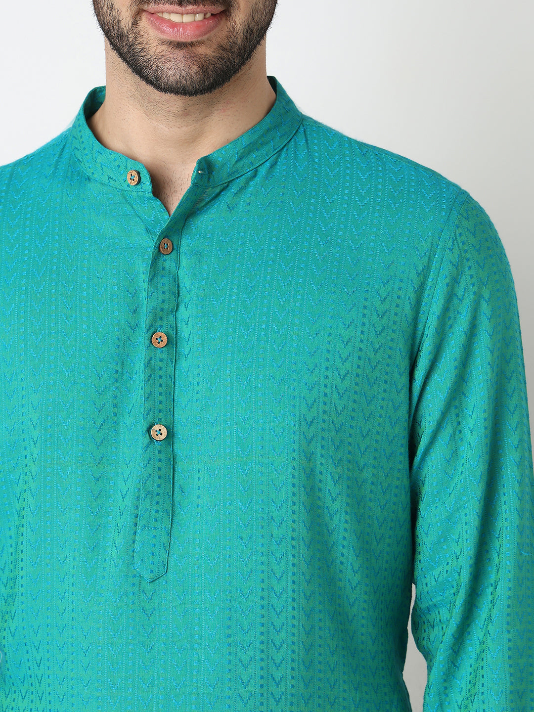 This structured pattern kurta has a mandarin collar and full sleeve. Made from cotton, it is soft and comfortable to wear.
