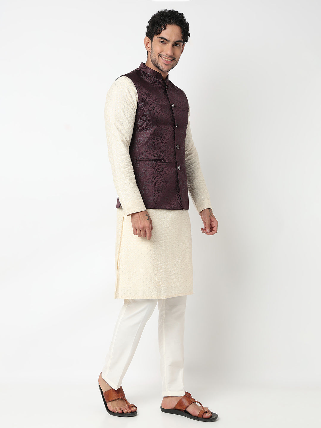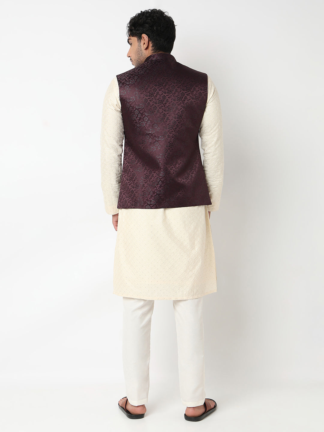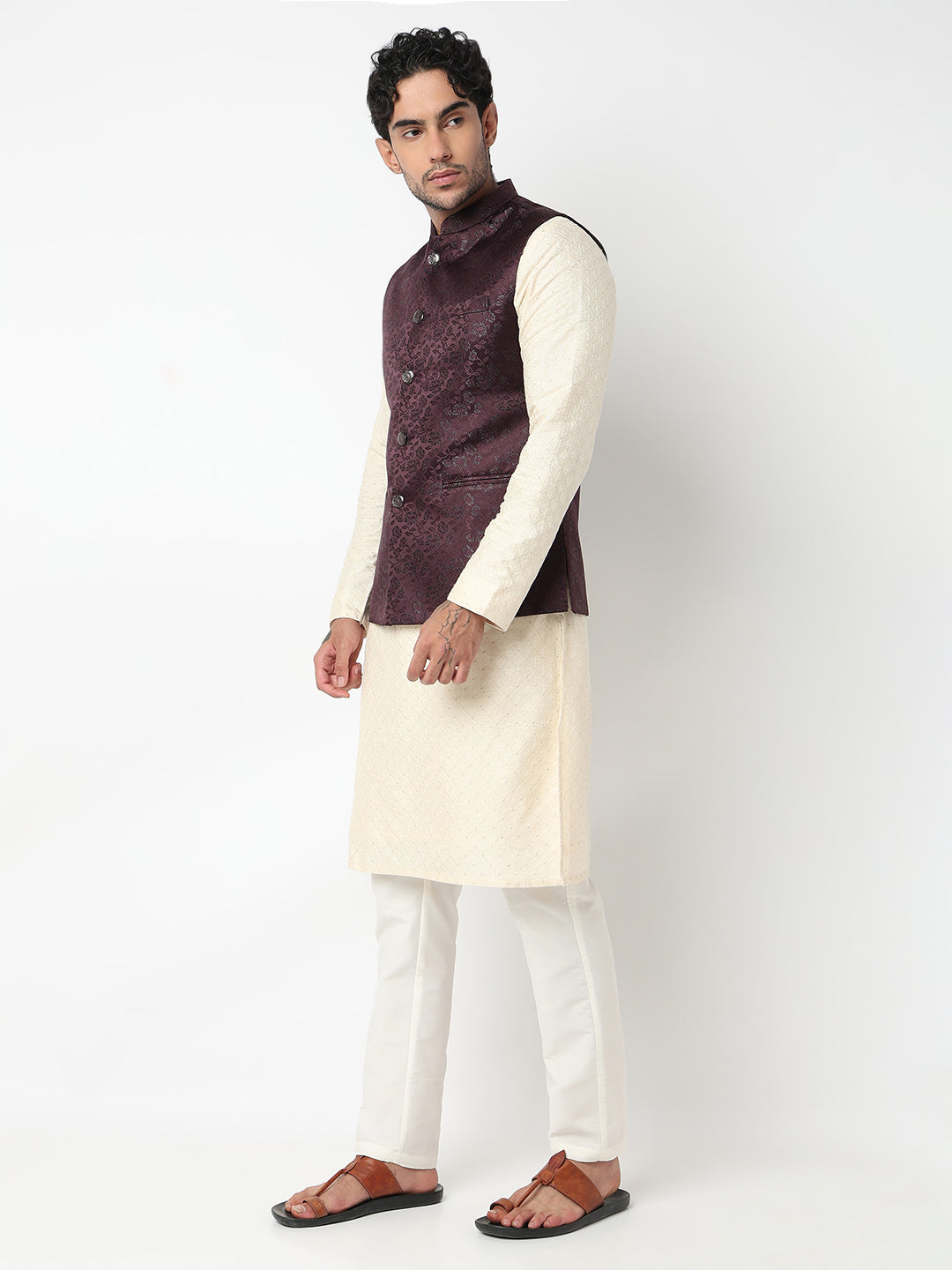 This jacquard pattern ethnic jacket has a mandarin collar and sleeveless. Made from jacquard, it is soft and comfortable to wear.