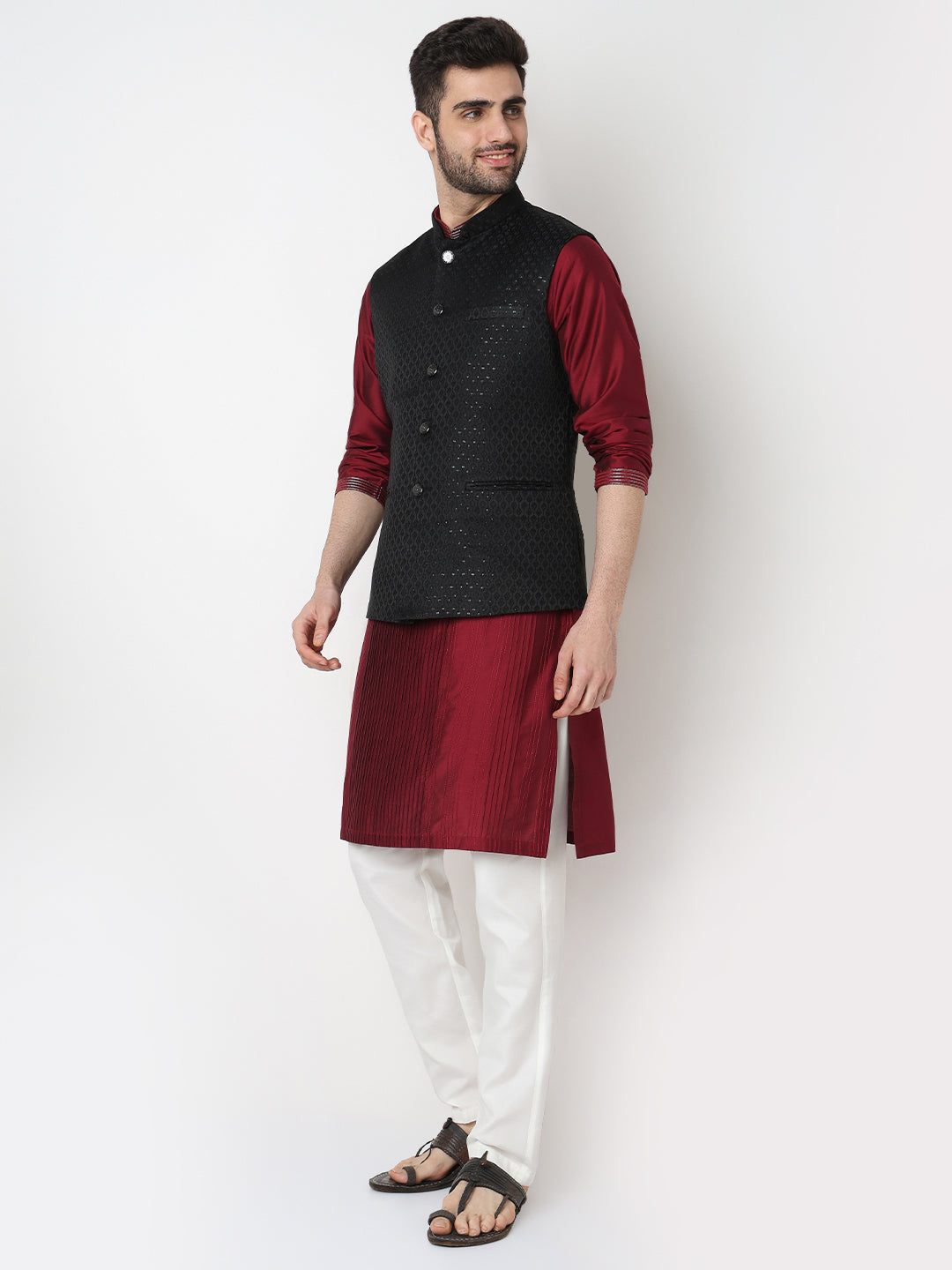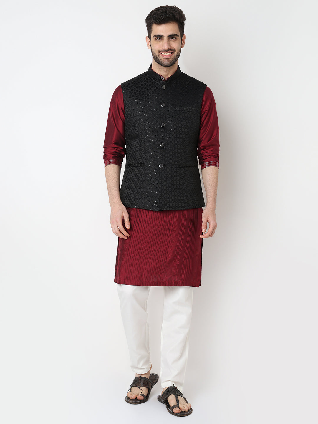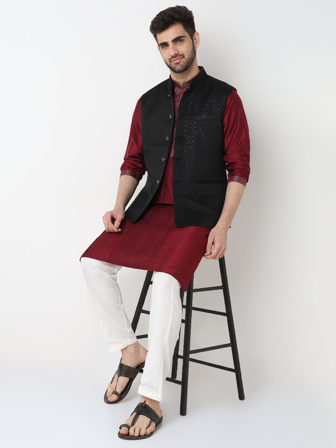 This jacquard pattern jacket has a mandarin collar and sleeveless. Made from jacquard, it is soft and comfortable to wear.