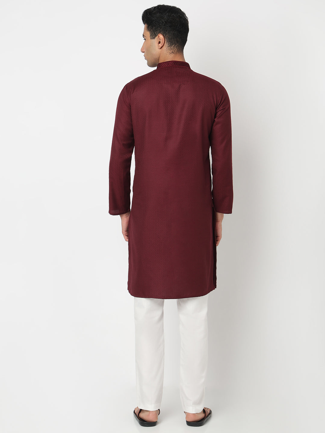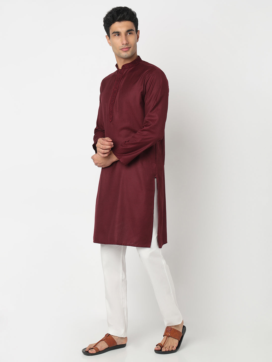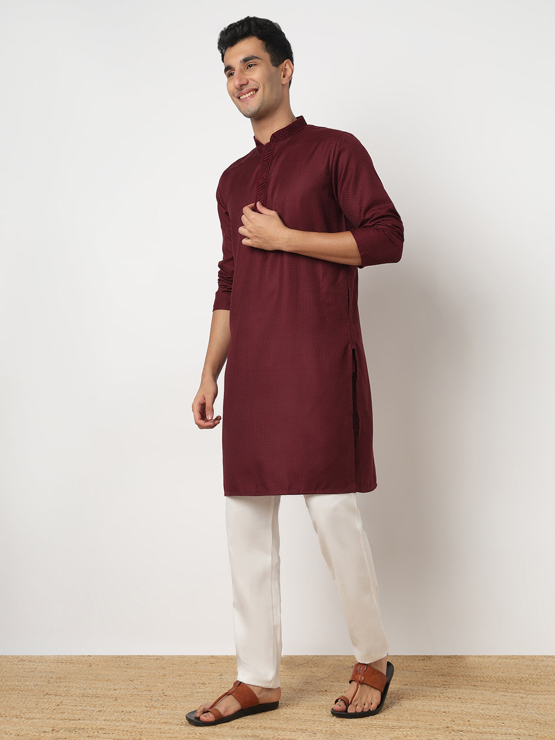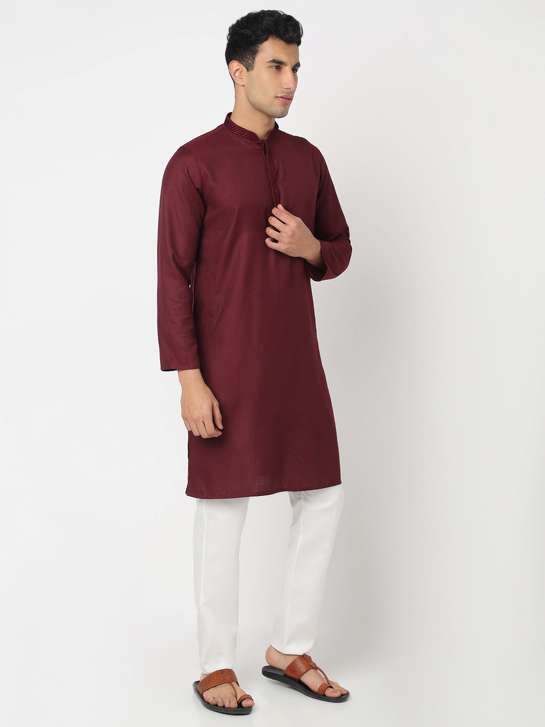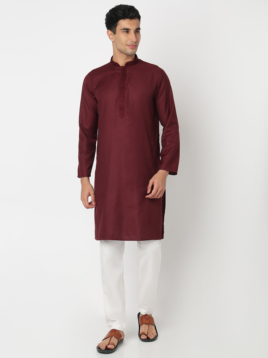This jacquard pattern kurta has a mandarin collar and full sleeve. Made from cotton, it is soft and comfortable to wear.