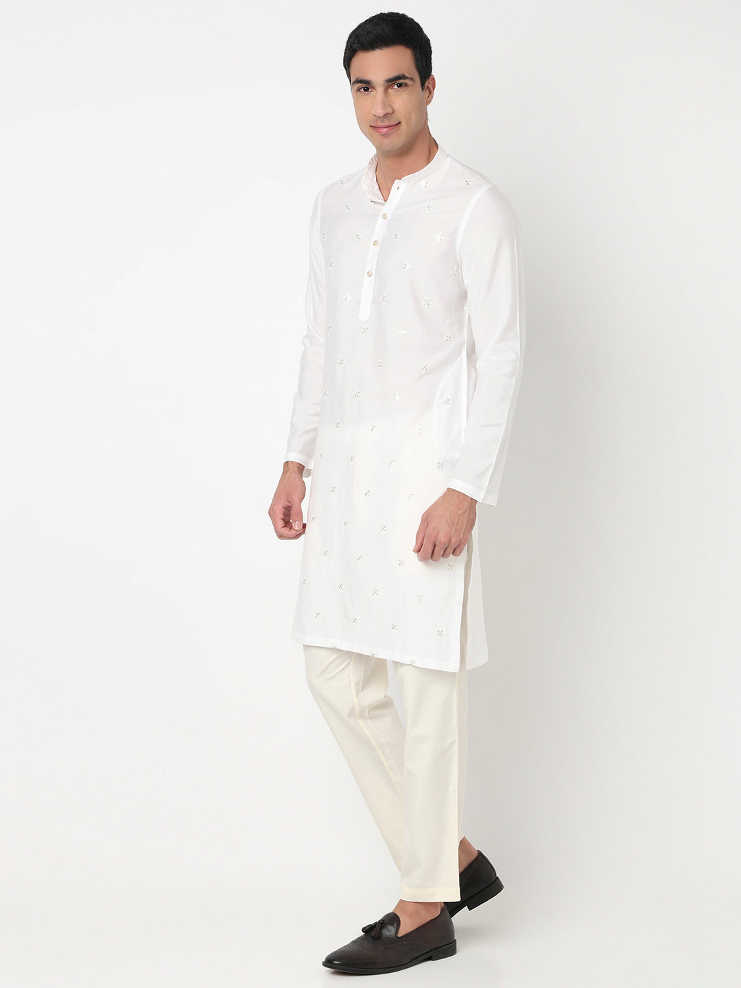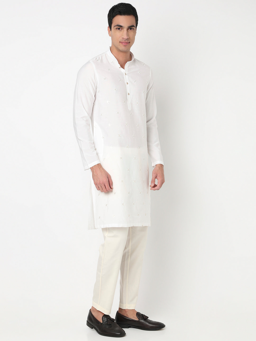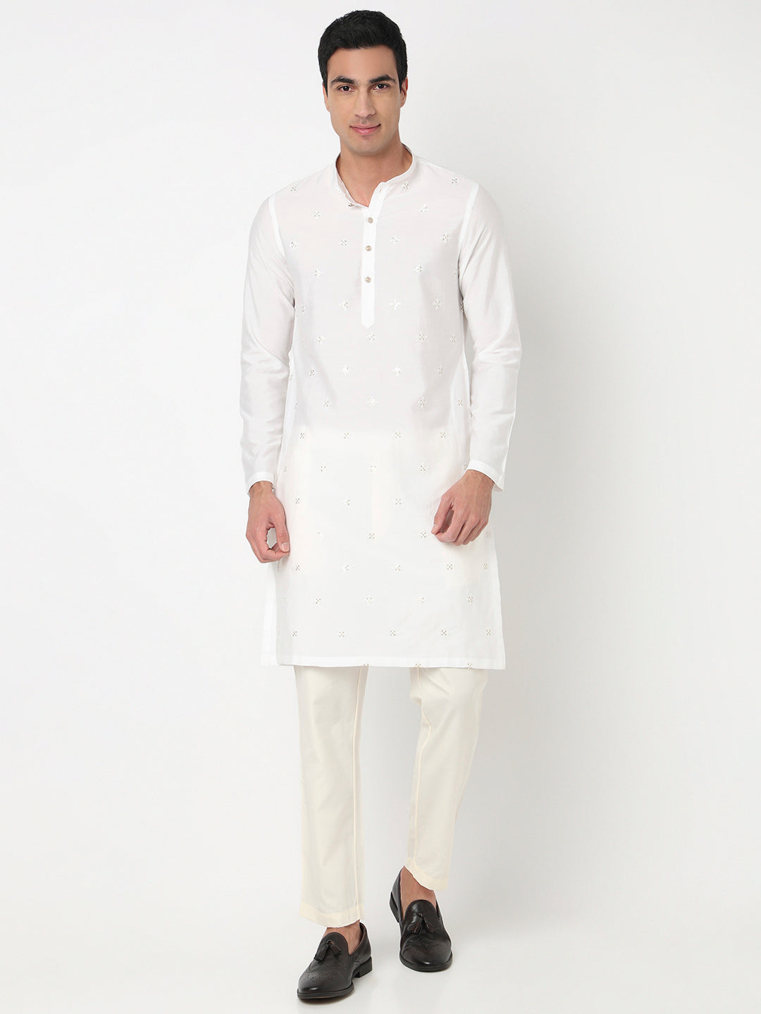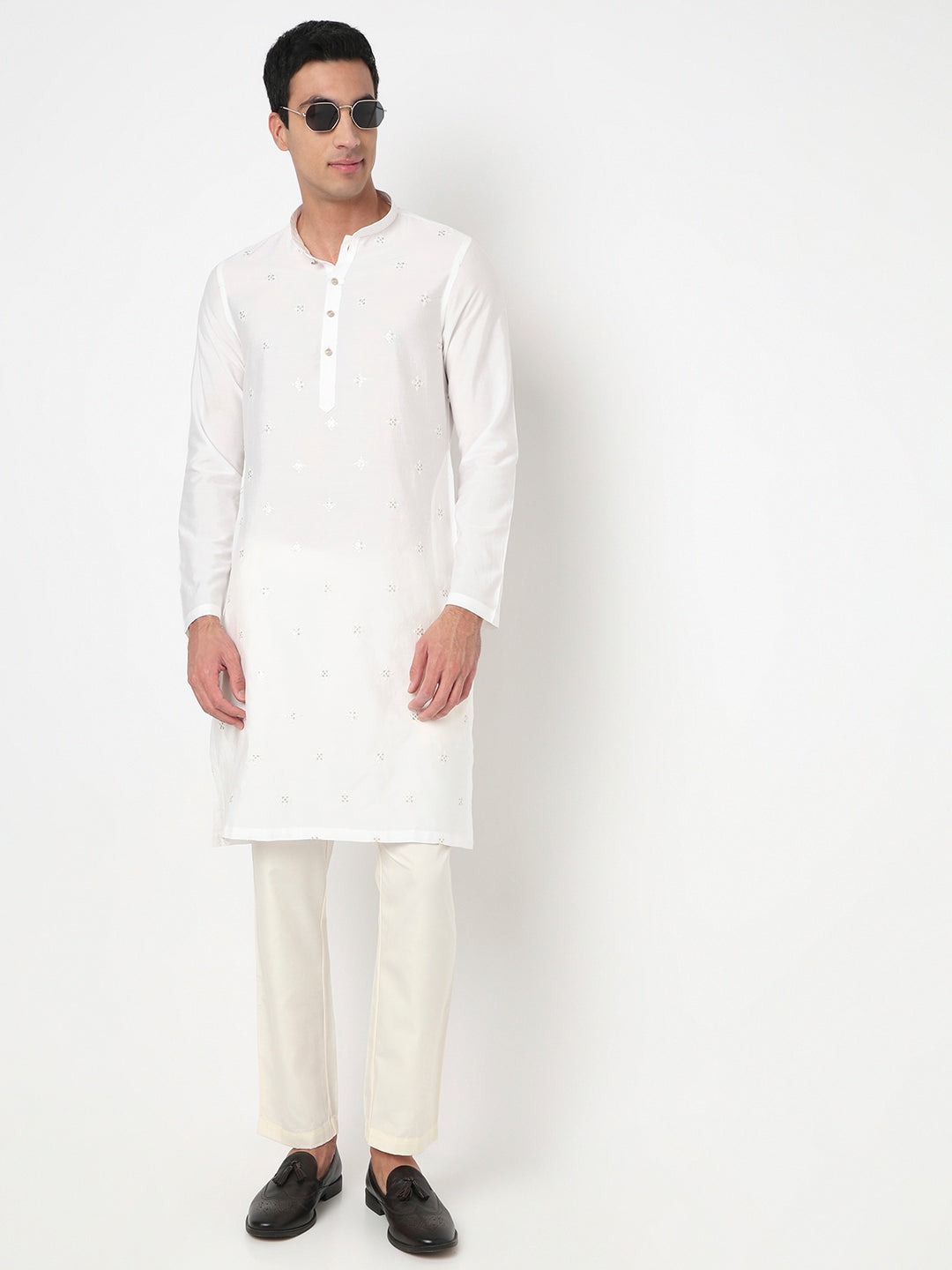 This embroidered pattern kurta has a mandarin collar and full sleeve. Made from viscose polyester, it is soft and comfortable to wear.