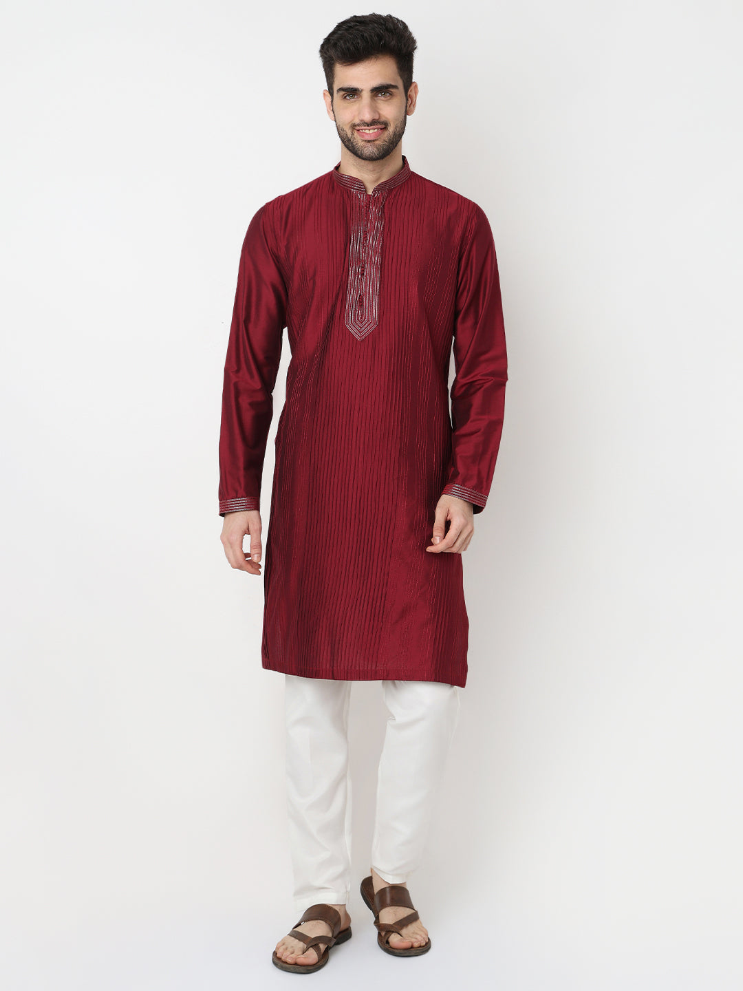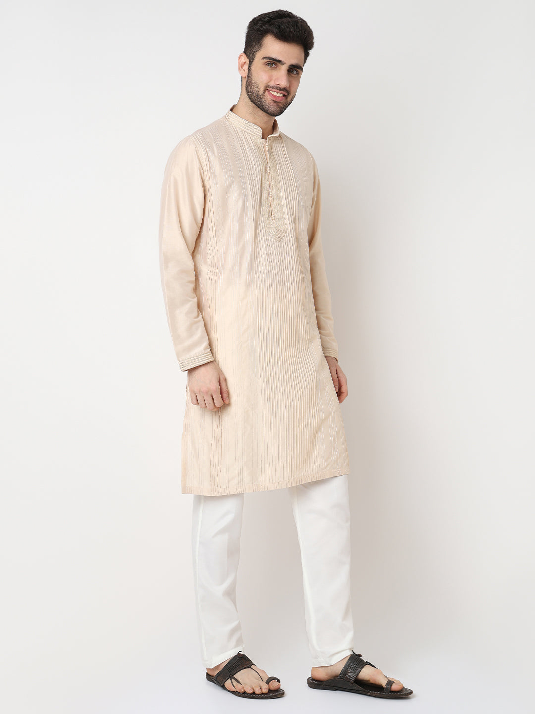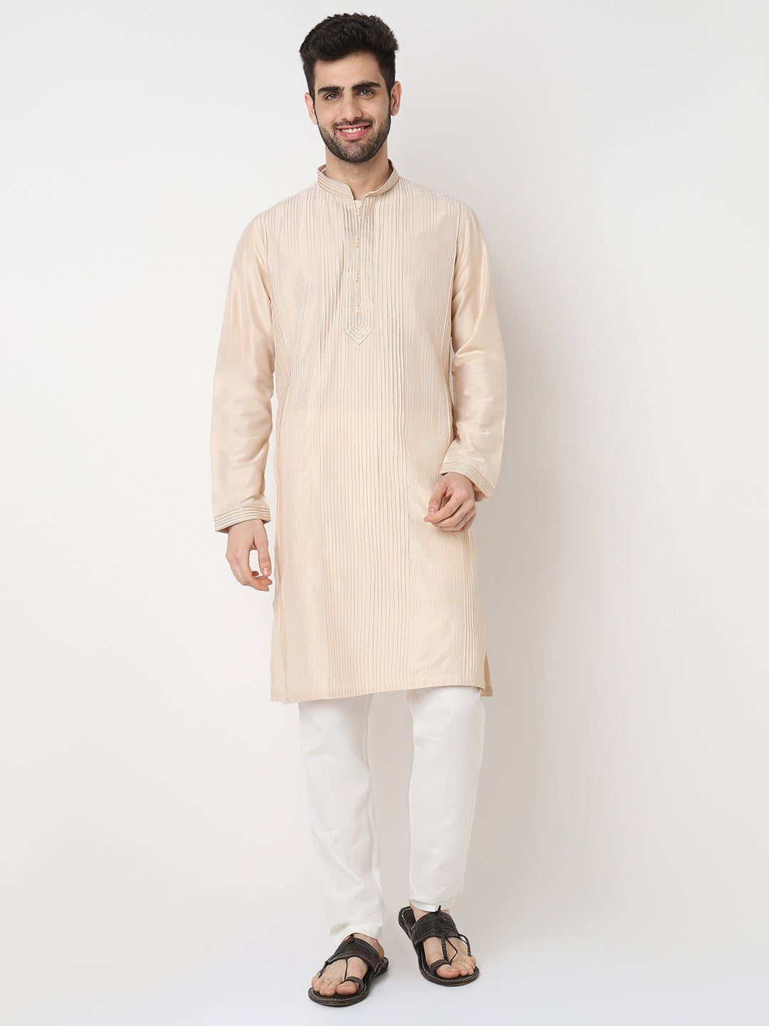 This pintucks pattern kurta has a mandarin collar and full sleeve. Made from viscose polyester, it is soft and comfortable to wear.