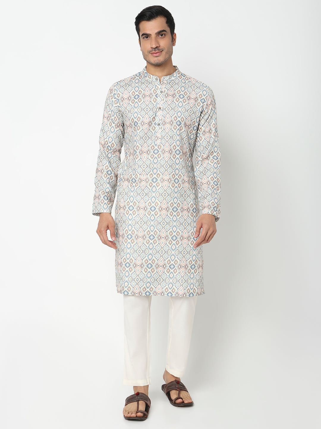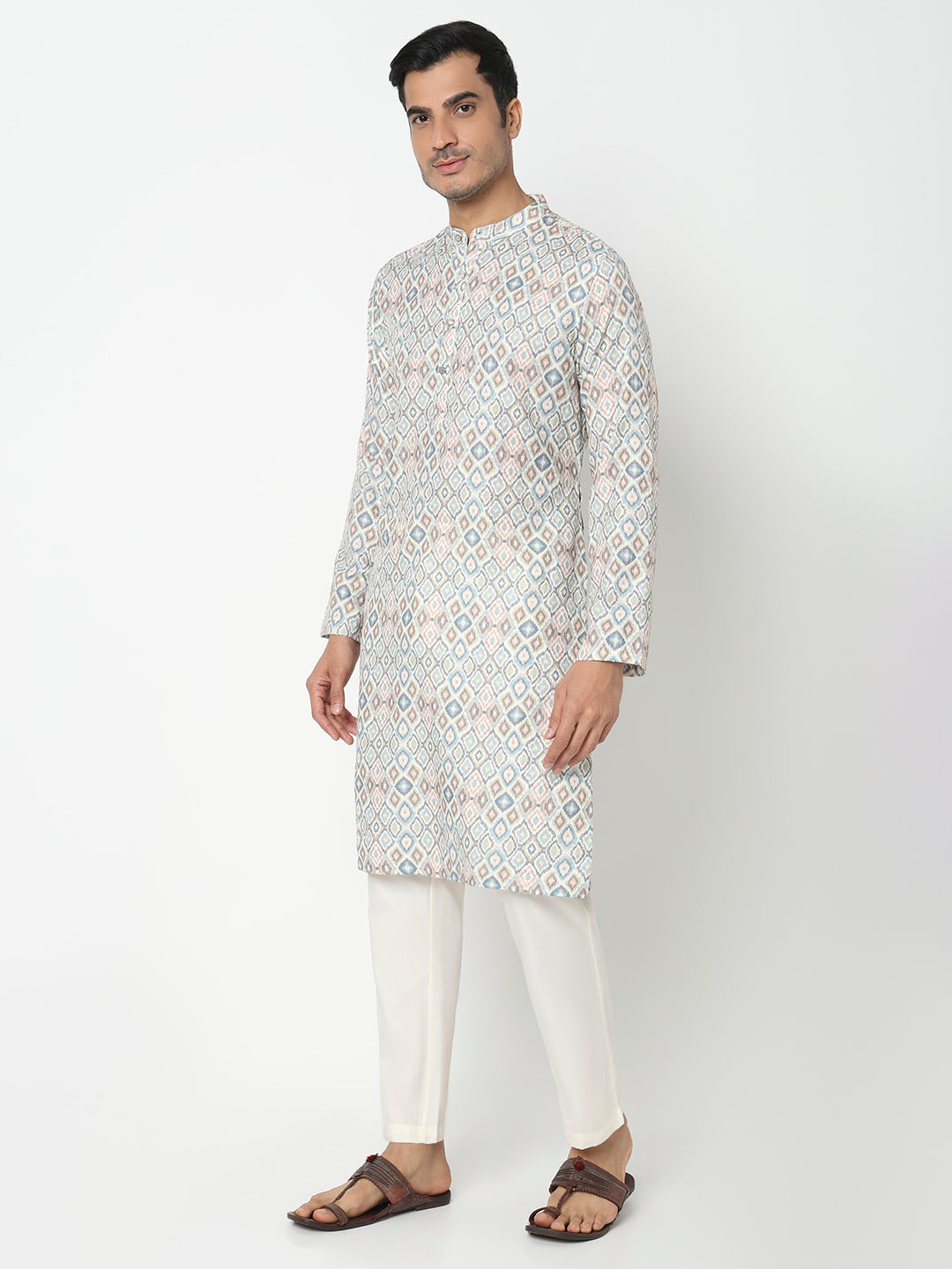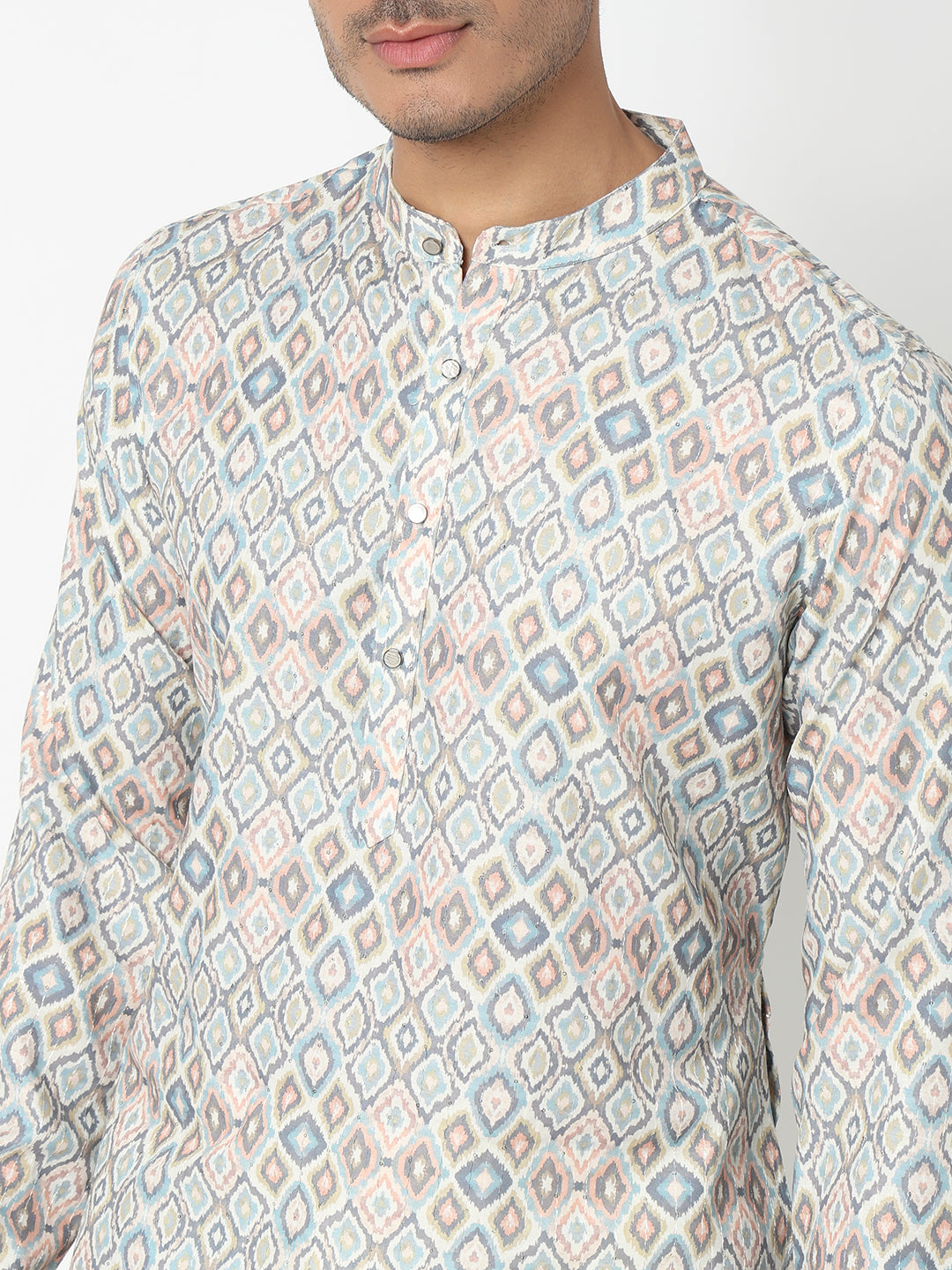 This digital printed pattern kurta has a mandarin collar and full sleeve. Made from polyester, it is soft and comfortable to wear.