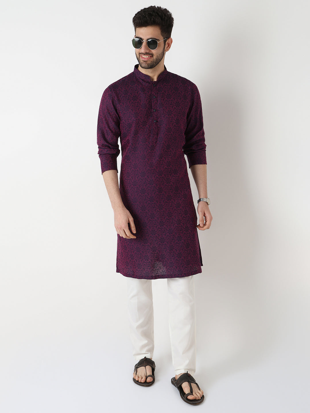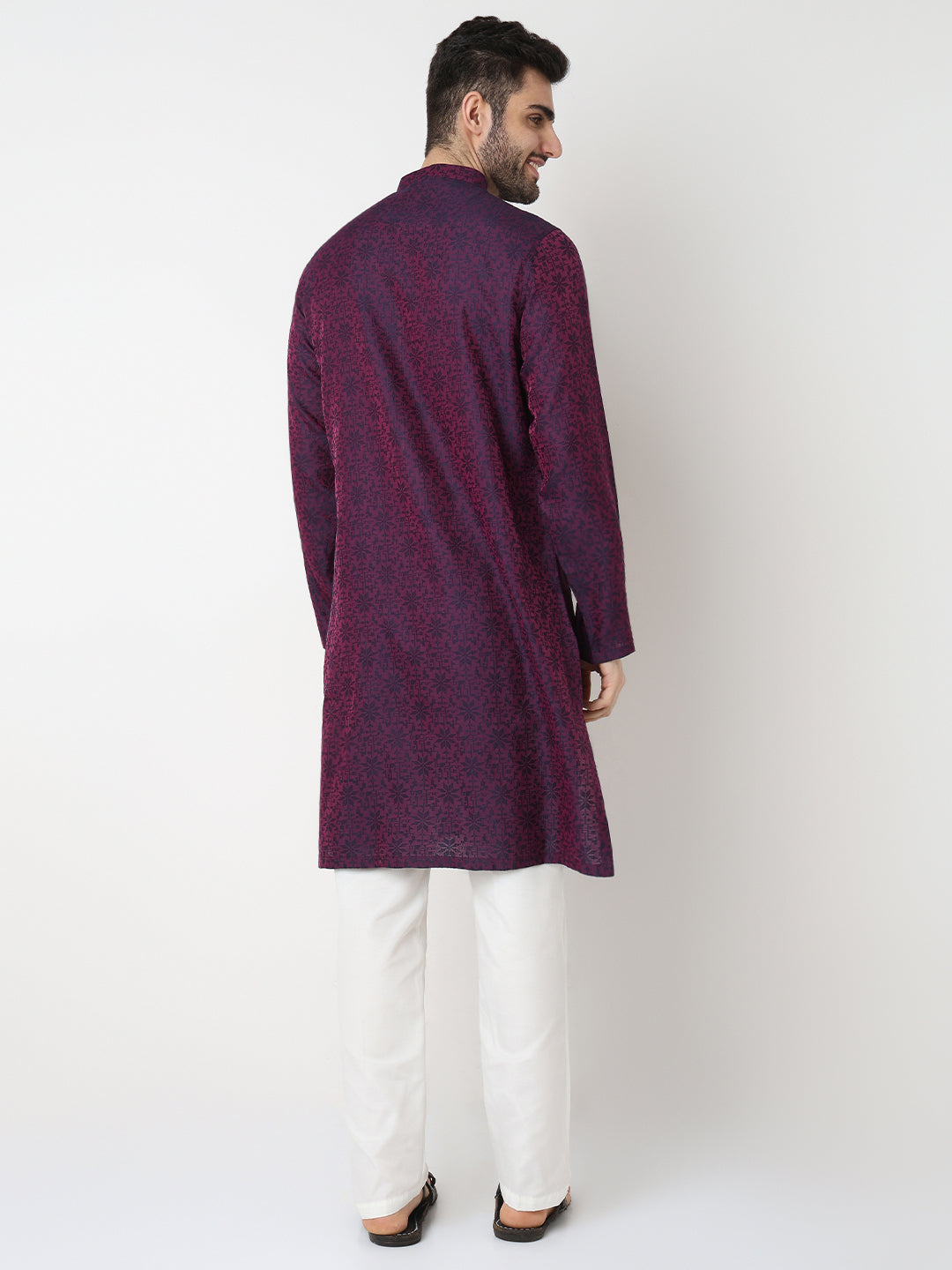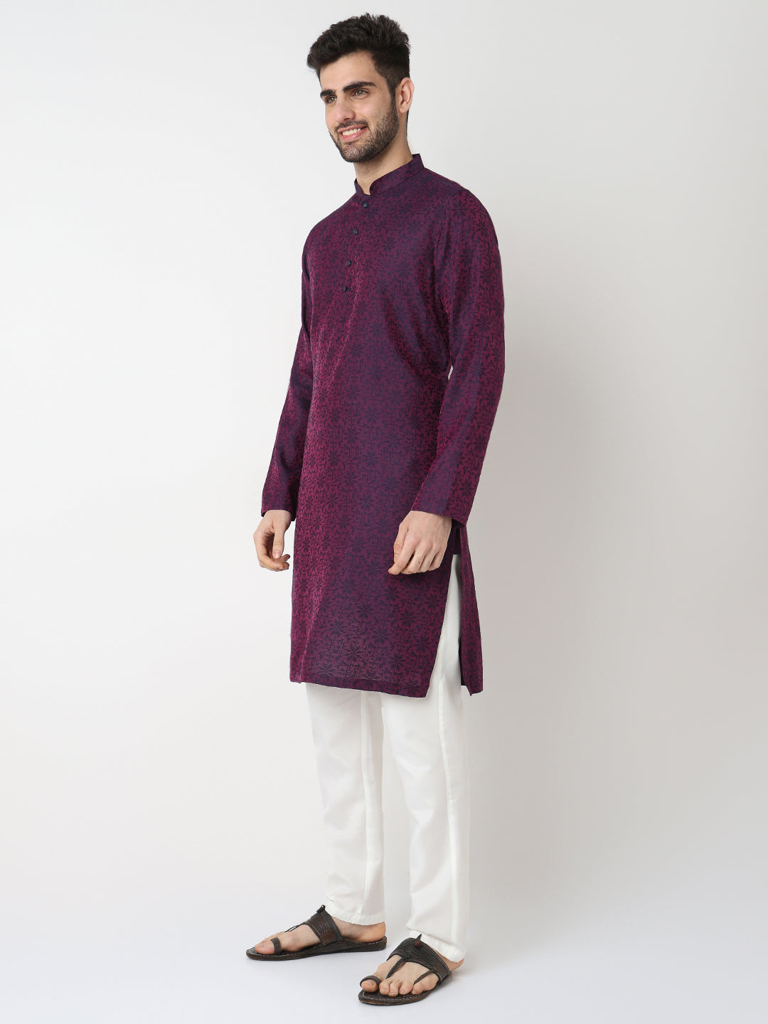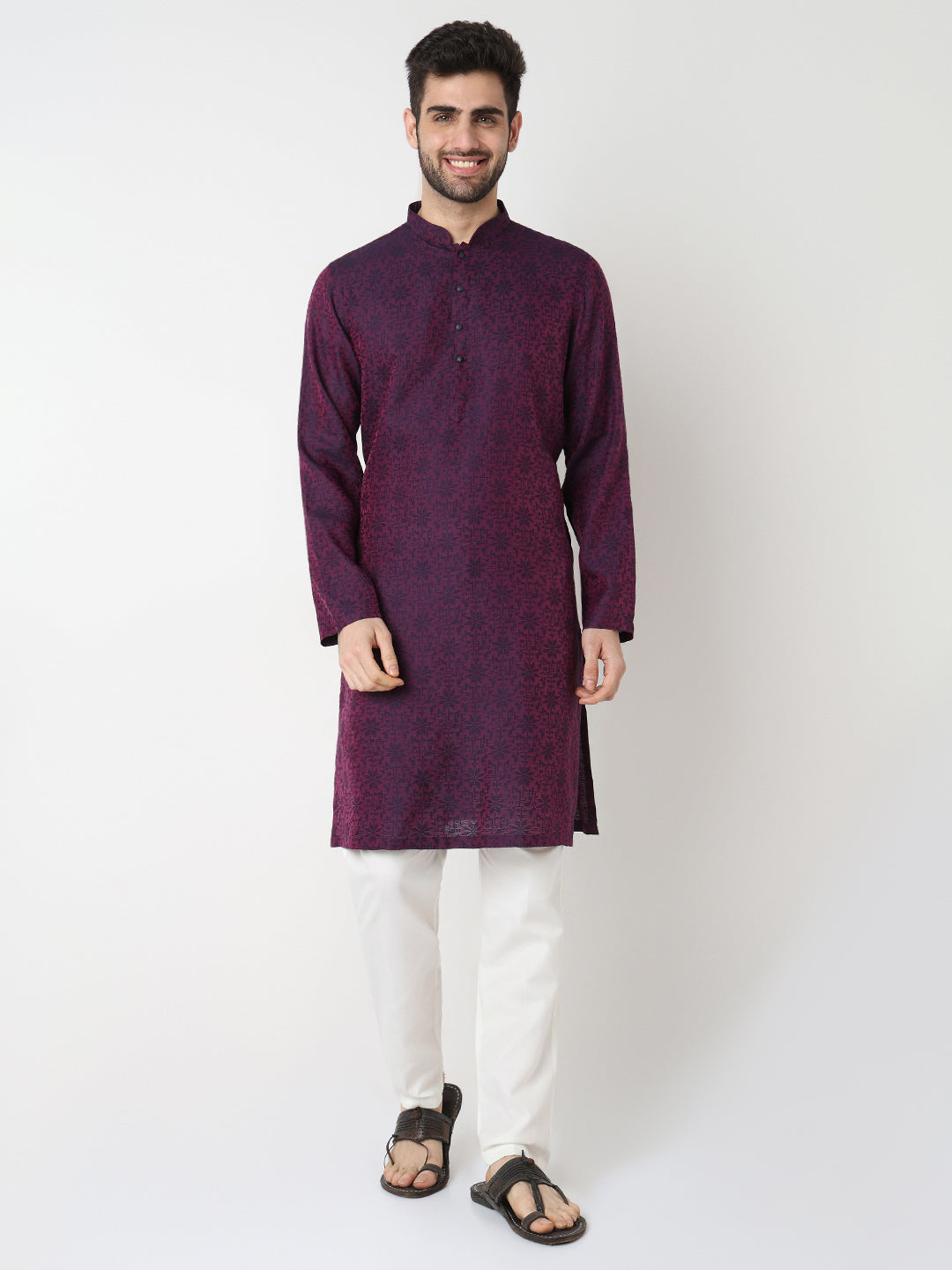This jacquard pattern kurta has a mandarin collar and full sleeve. Made from viscose polyester, it is soft and comfortable to wear.