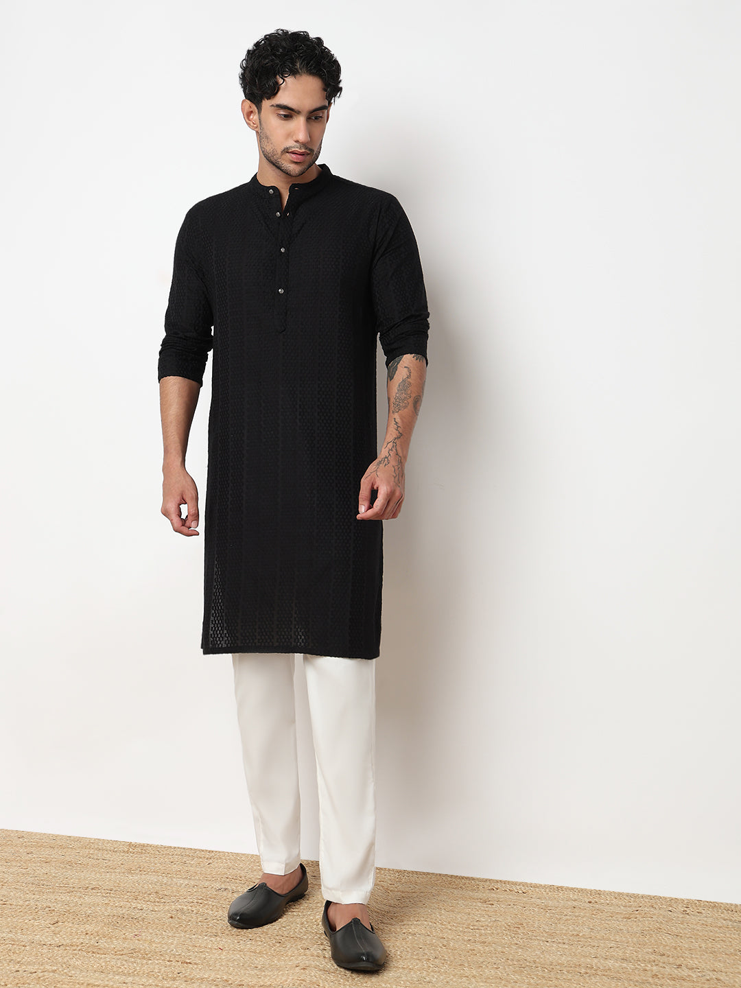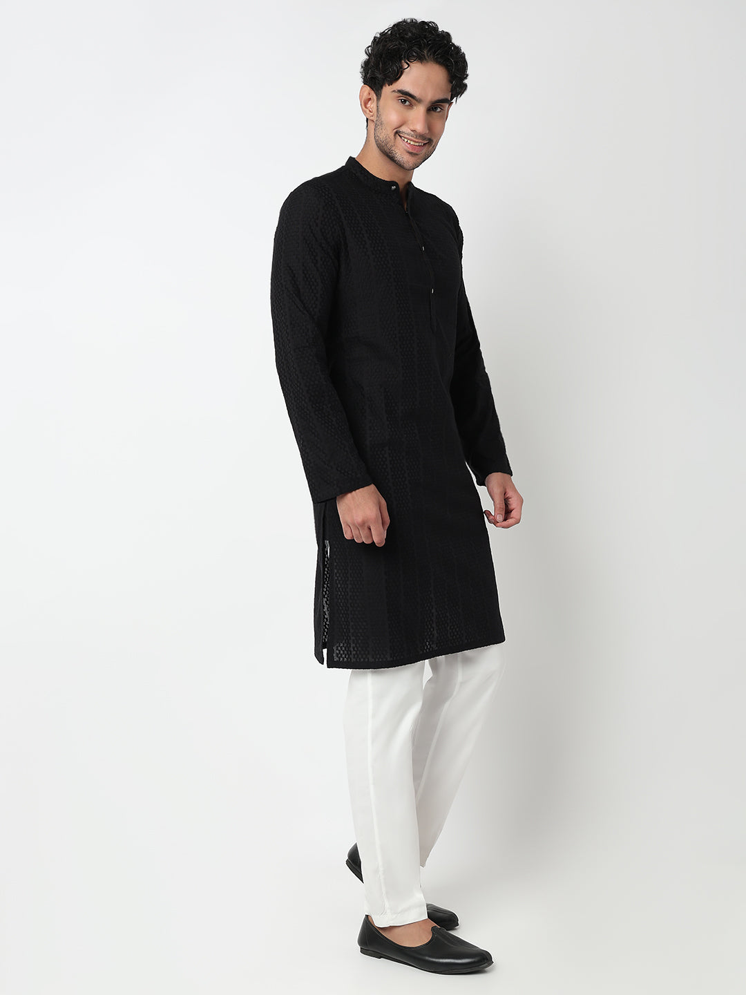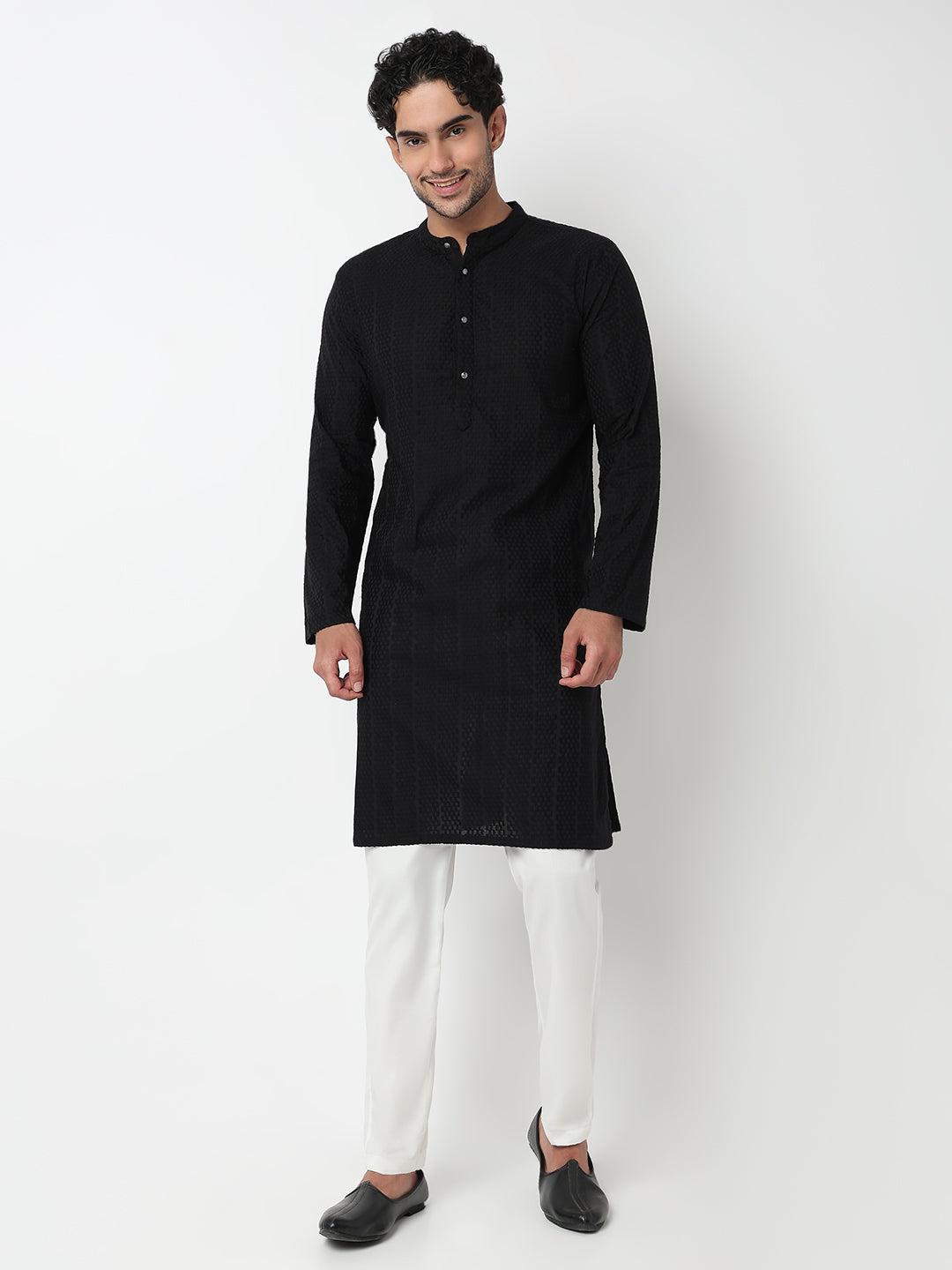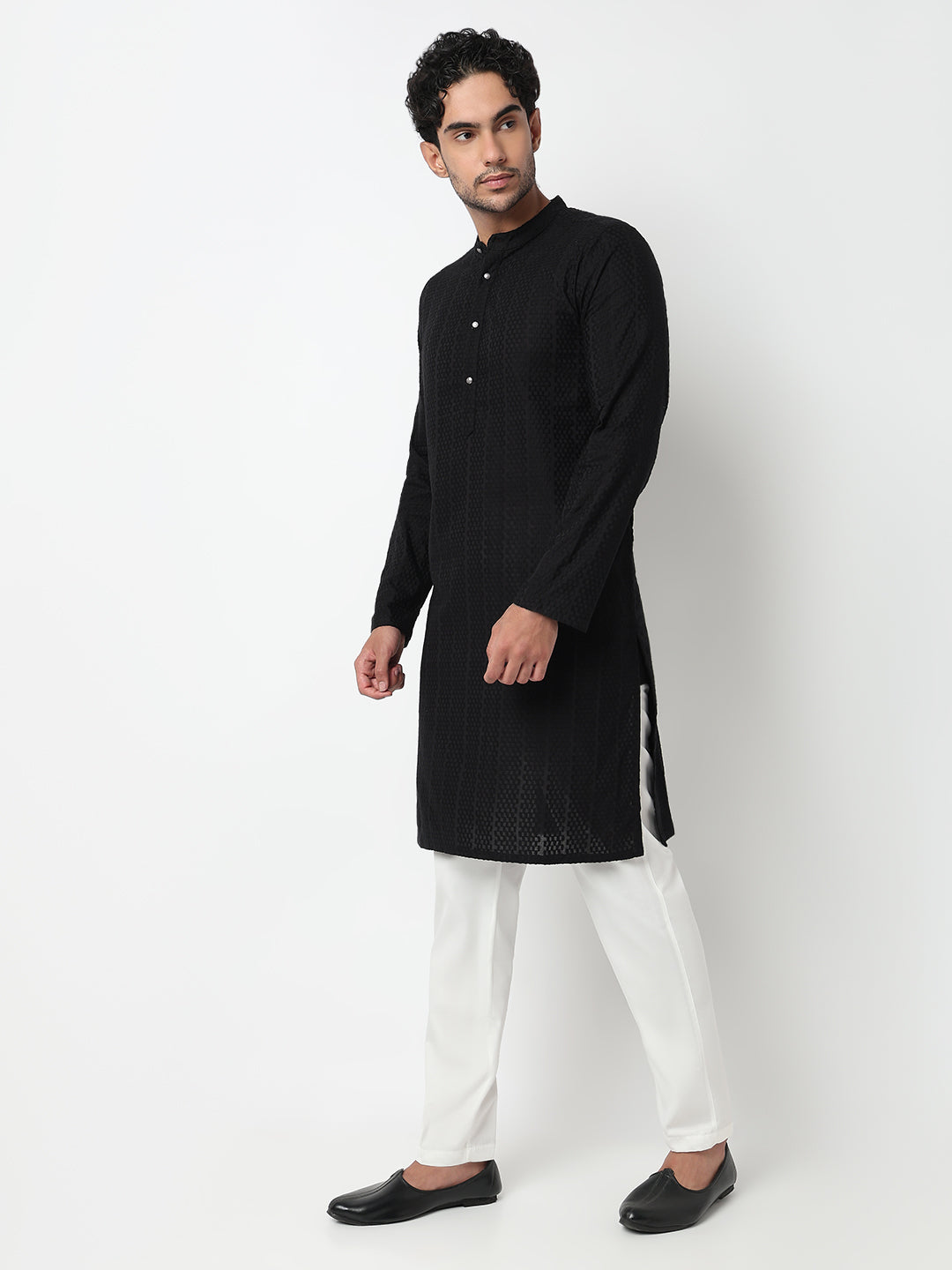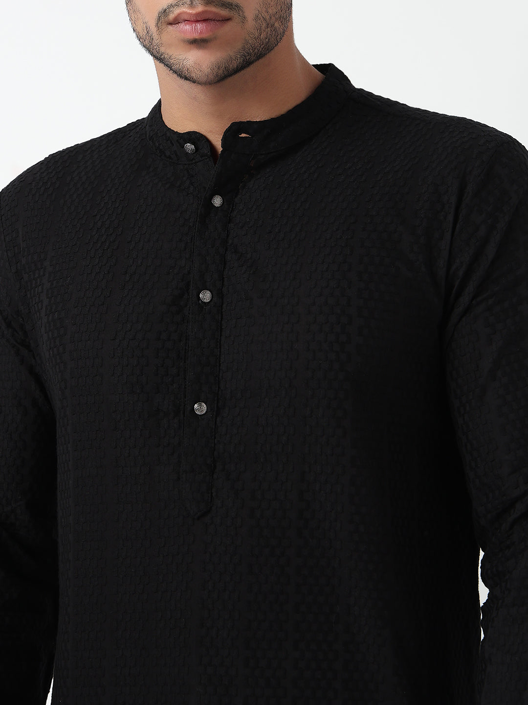 This lapet pattern kurta has a mandarin collar and full sleeve. Made from cotton, it is soft and comfortable to wear.