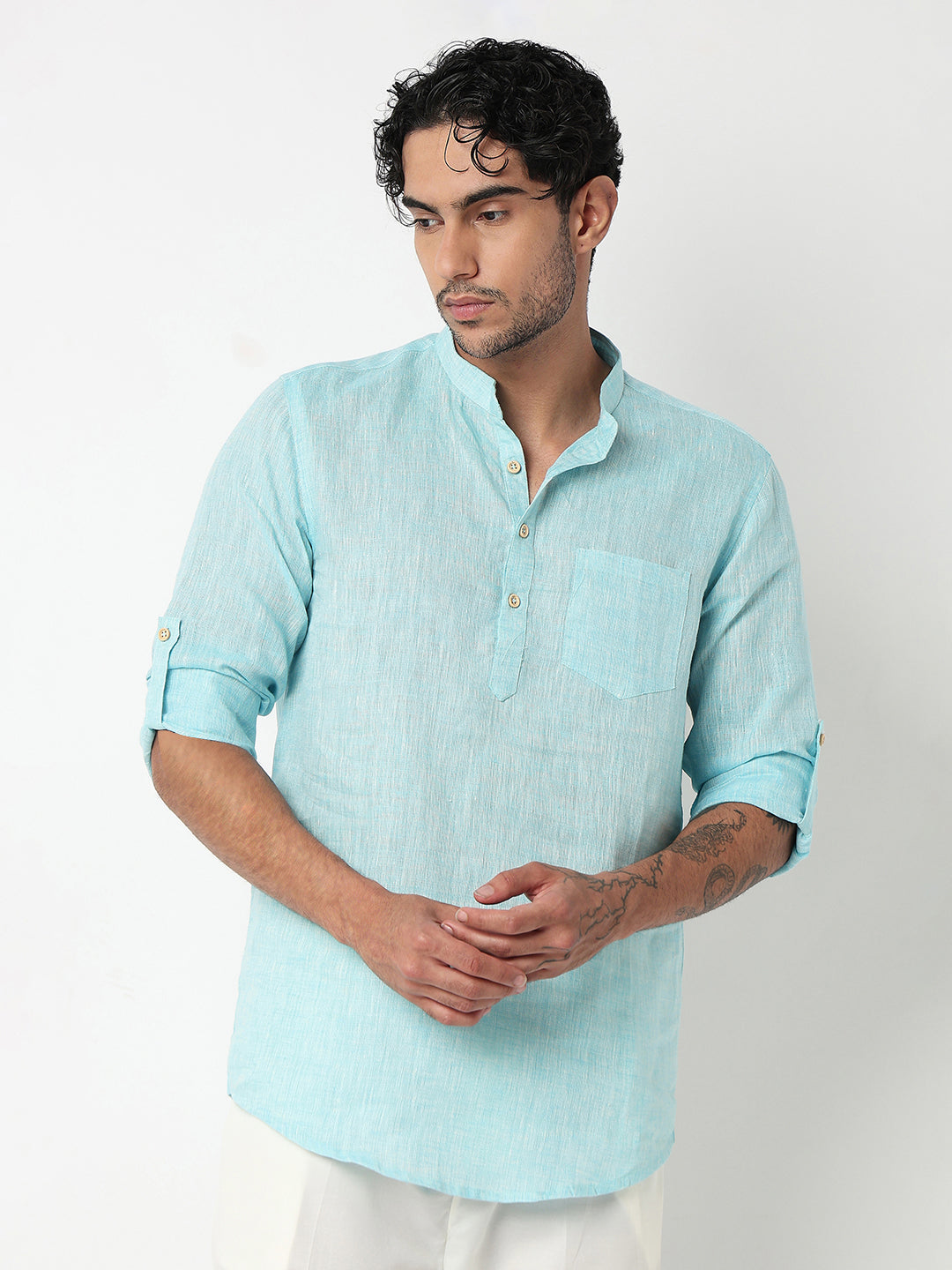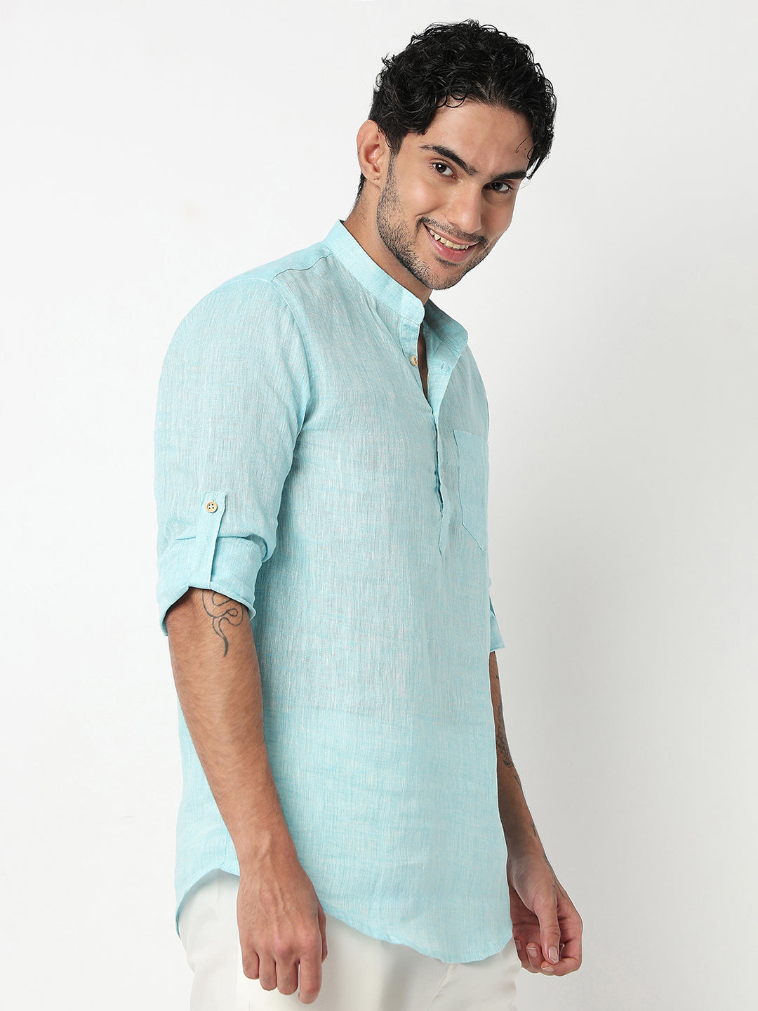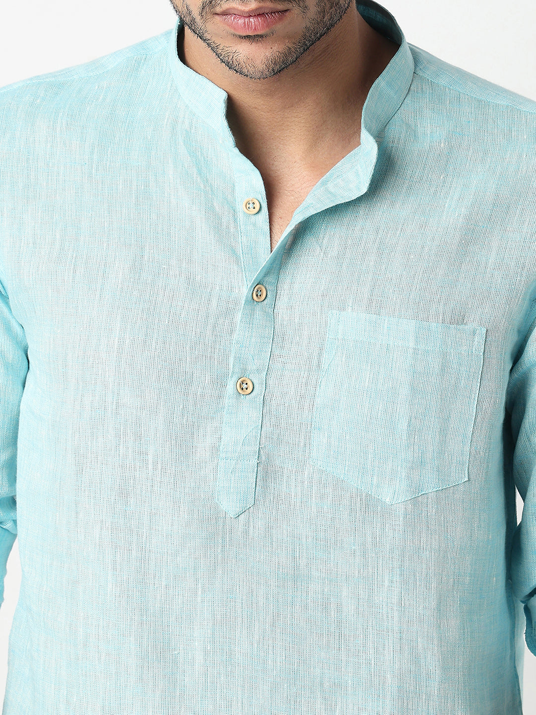 This solid pattern kurta has a mandarin collar and full sleeve. Made from linen cotton, it is soft and comfortable to wear.