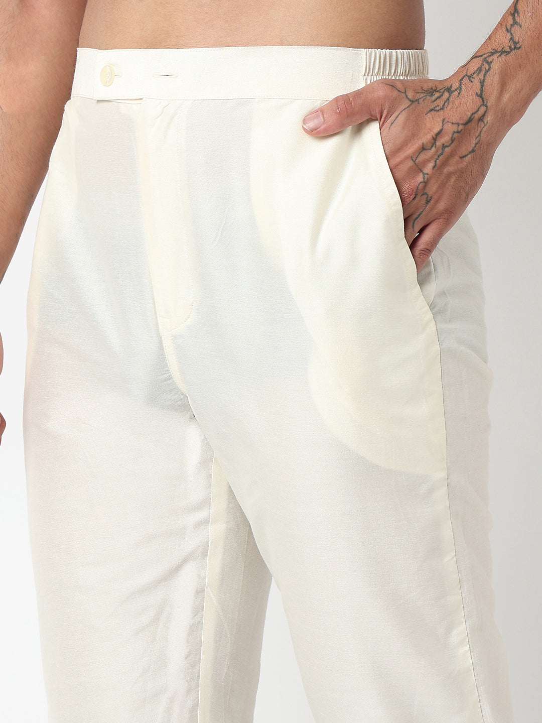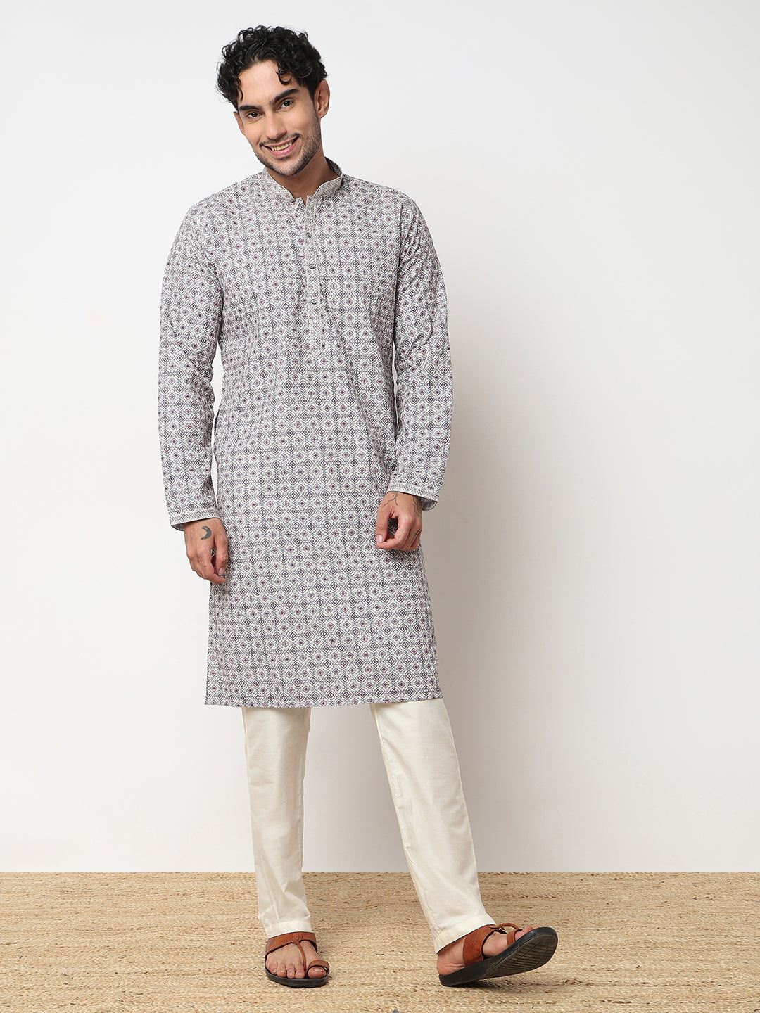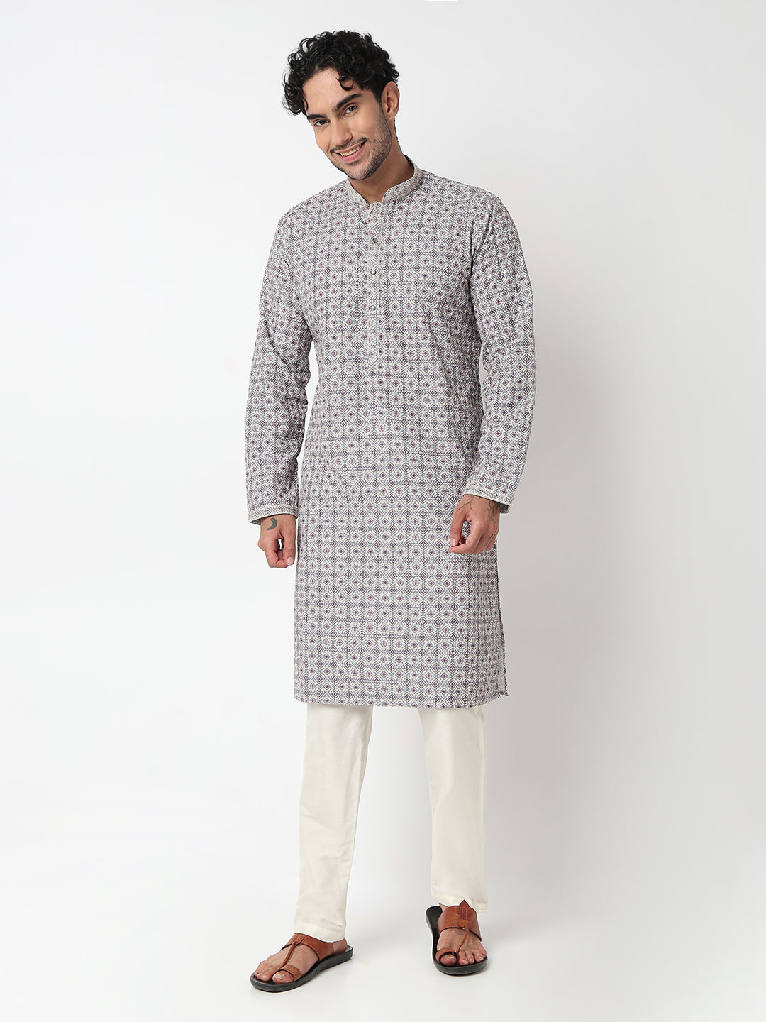 This digital schiffli pattern kurta with pant set has a mandarin collar and full sleeve. Made from polyester, it is soft and comfortable to wear.