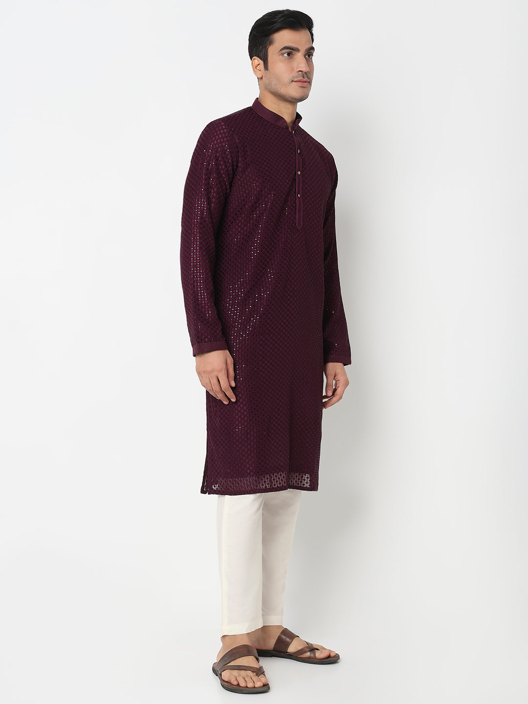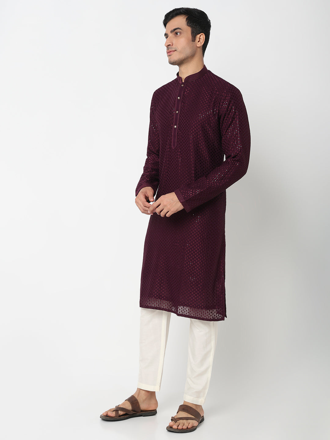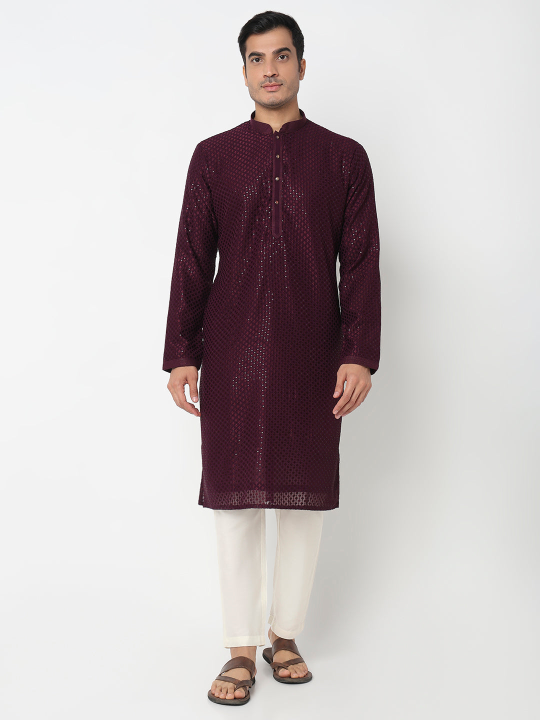 This embroidered pattern kurta with pant set has a mandarin collar and full sleeve. Made from georgette, it is soft and comfortable to wear.