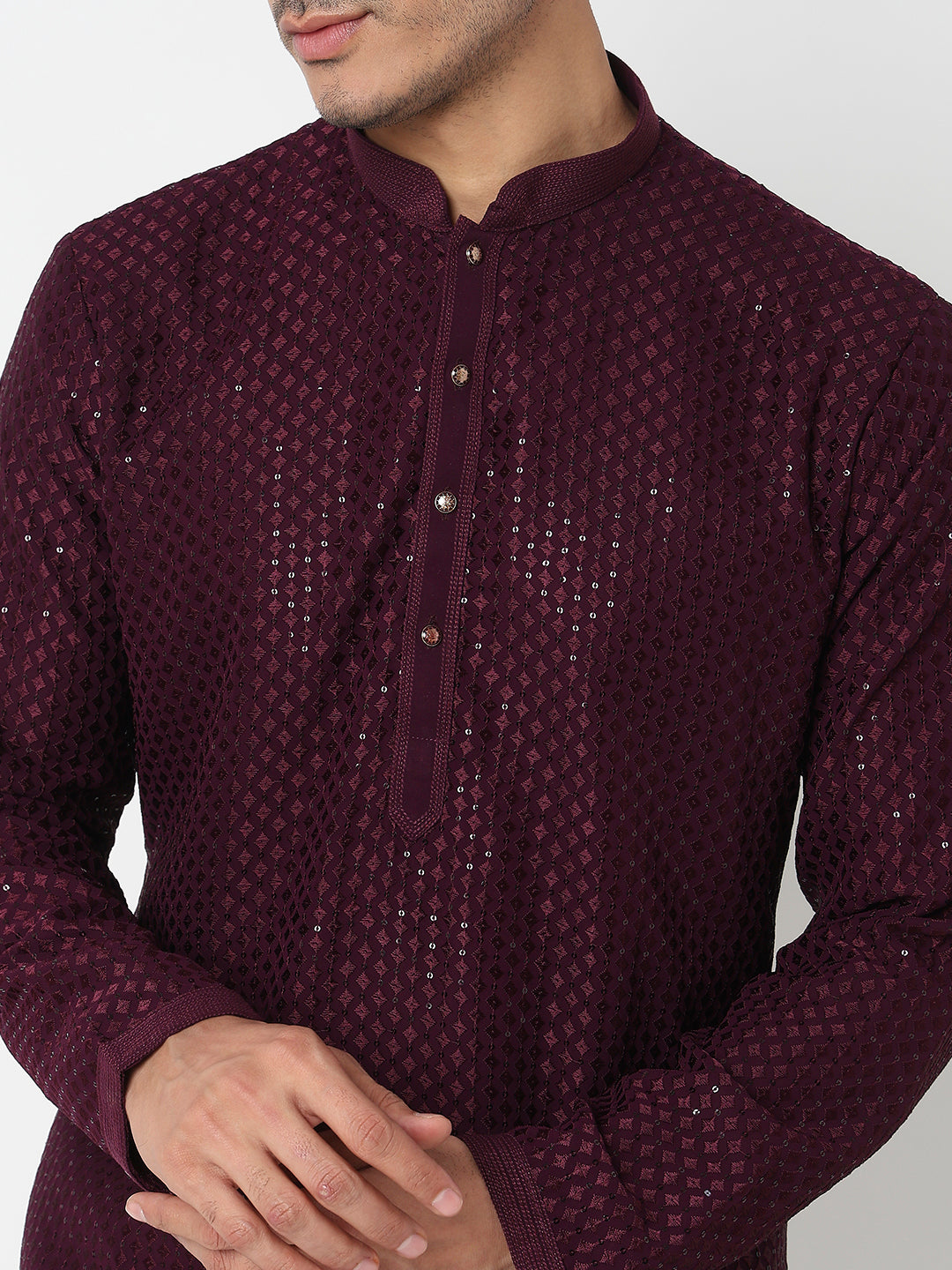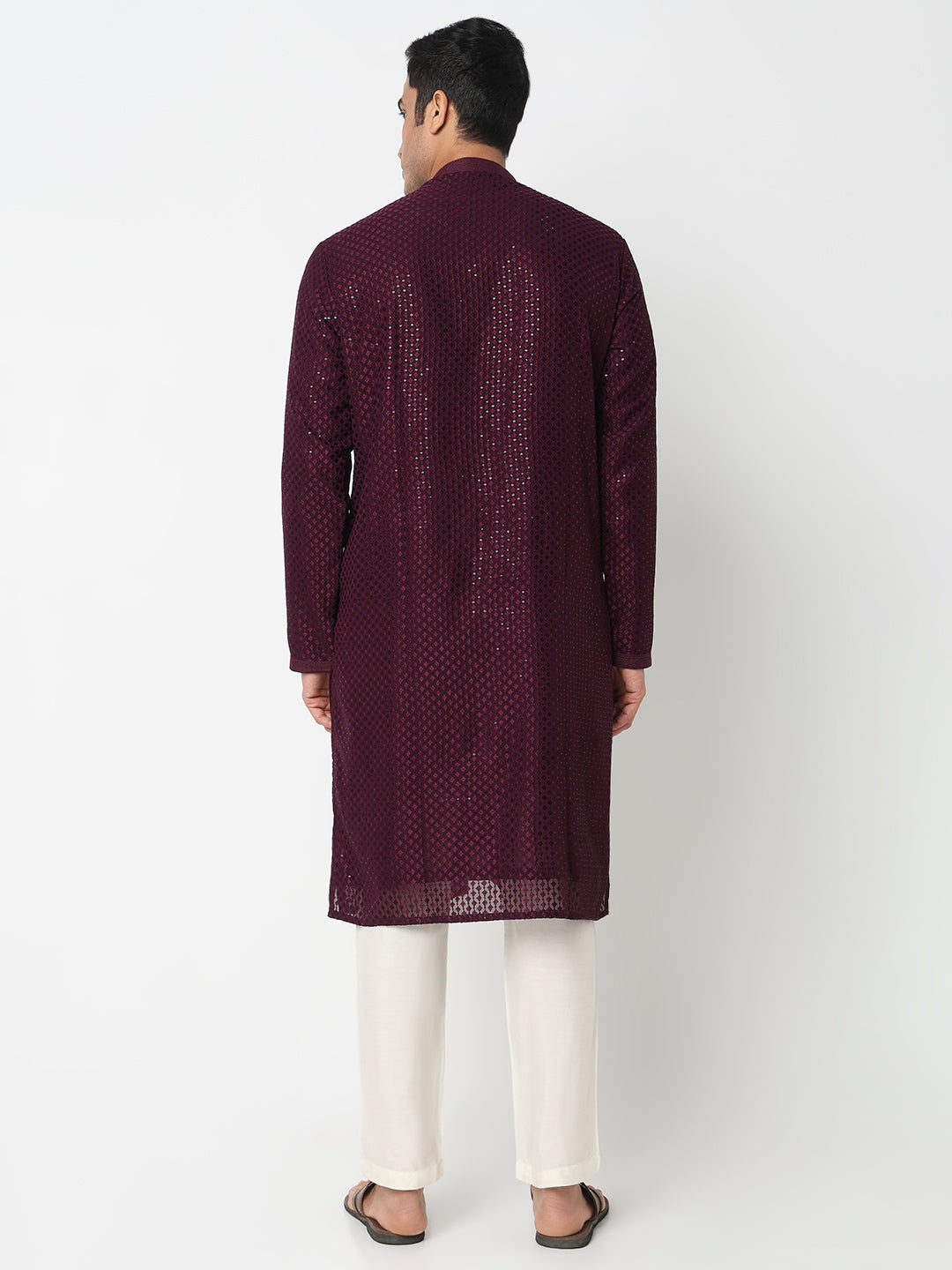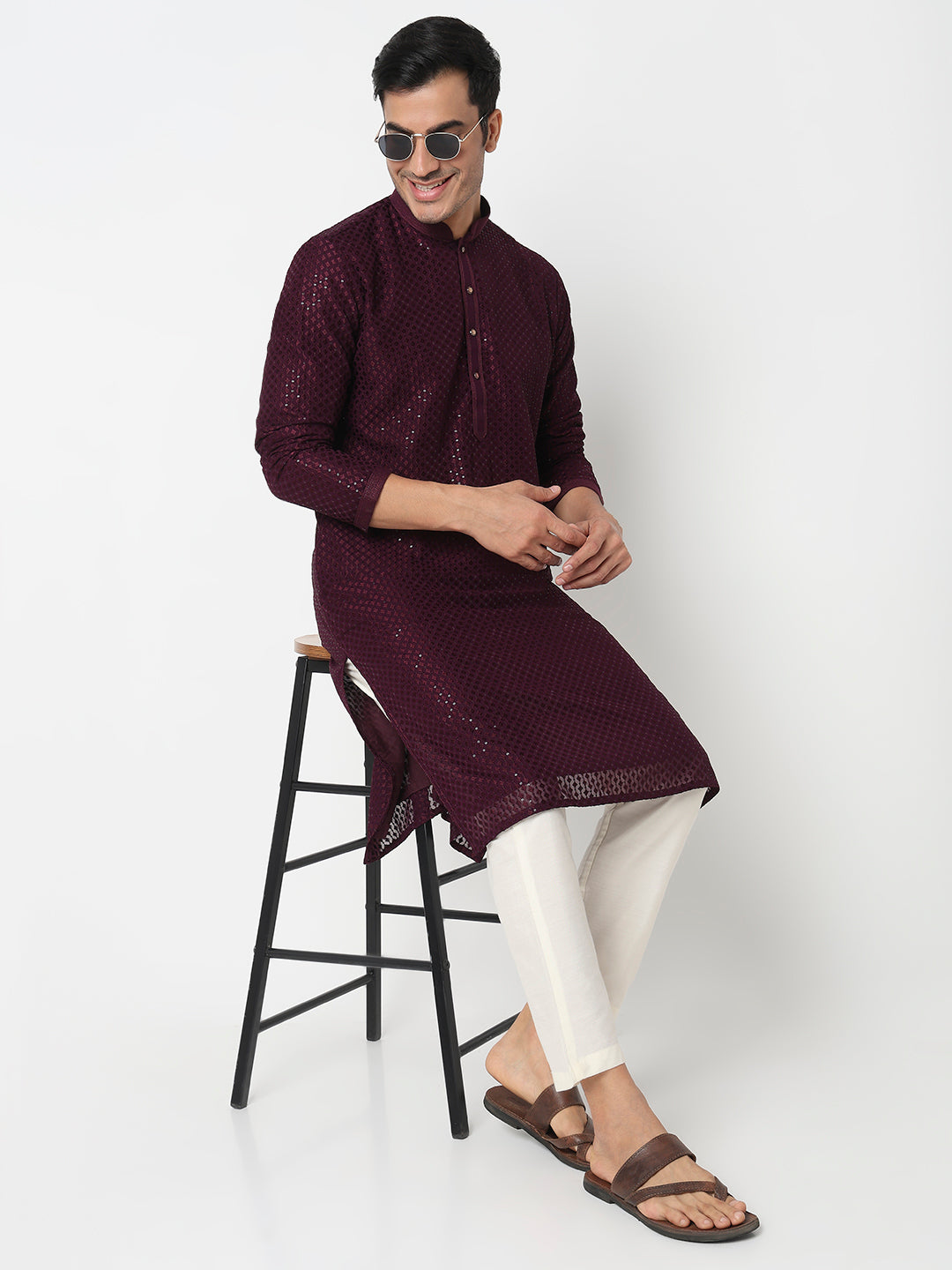 This embroidered pattern kurta with pant set has a mandarin collar and full sleeve. Made from georgette, it is soft and comfortable to wear.