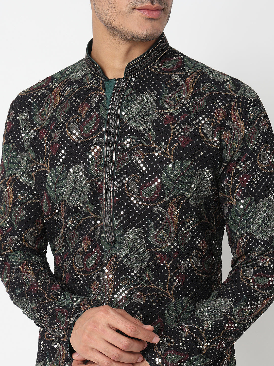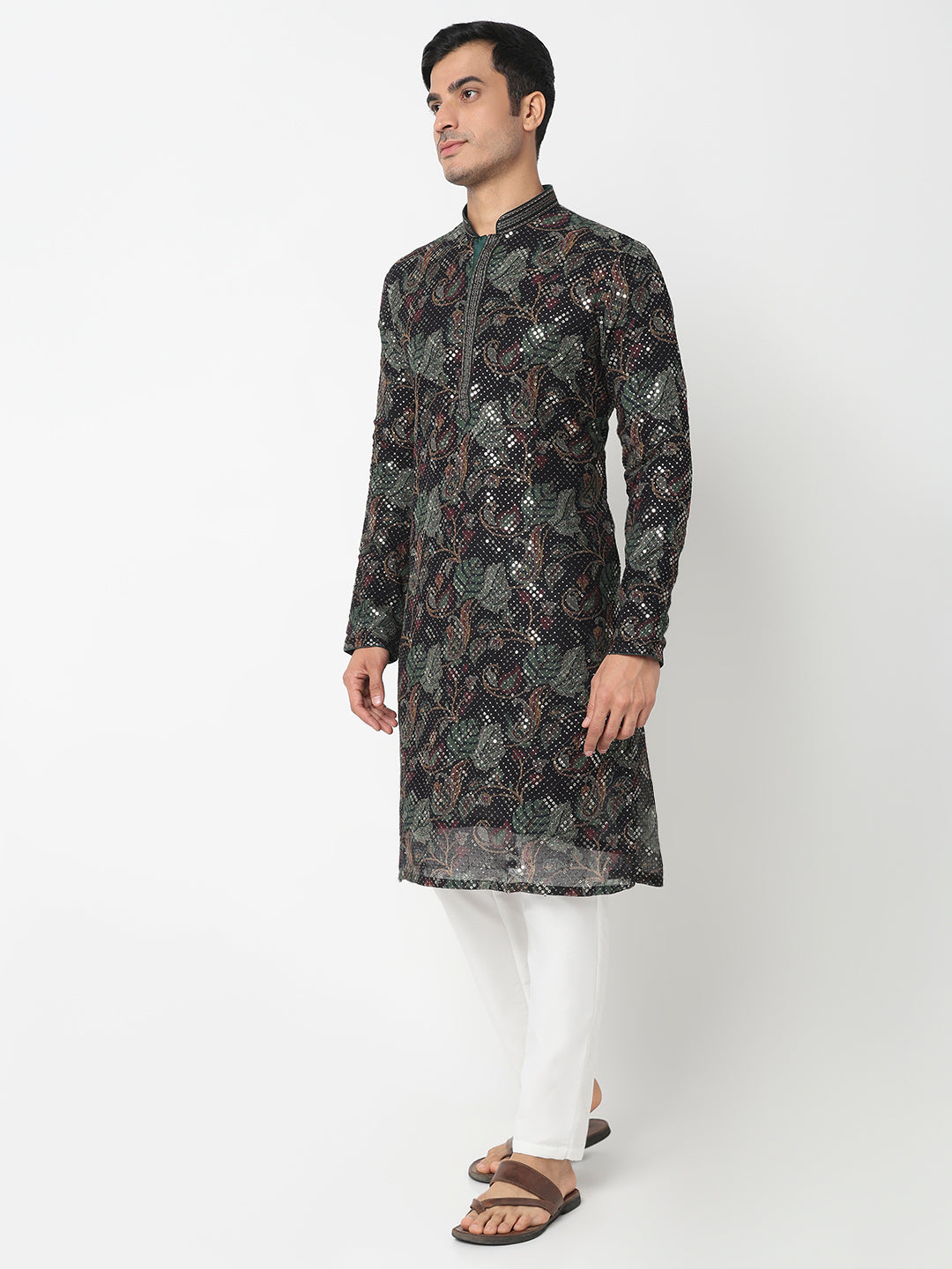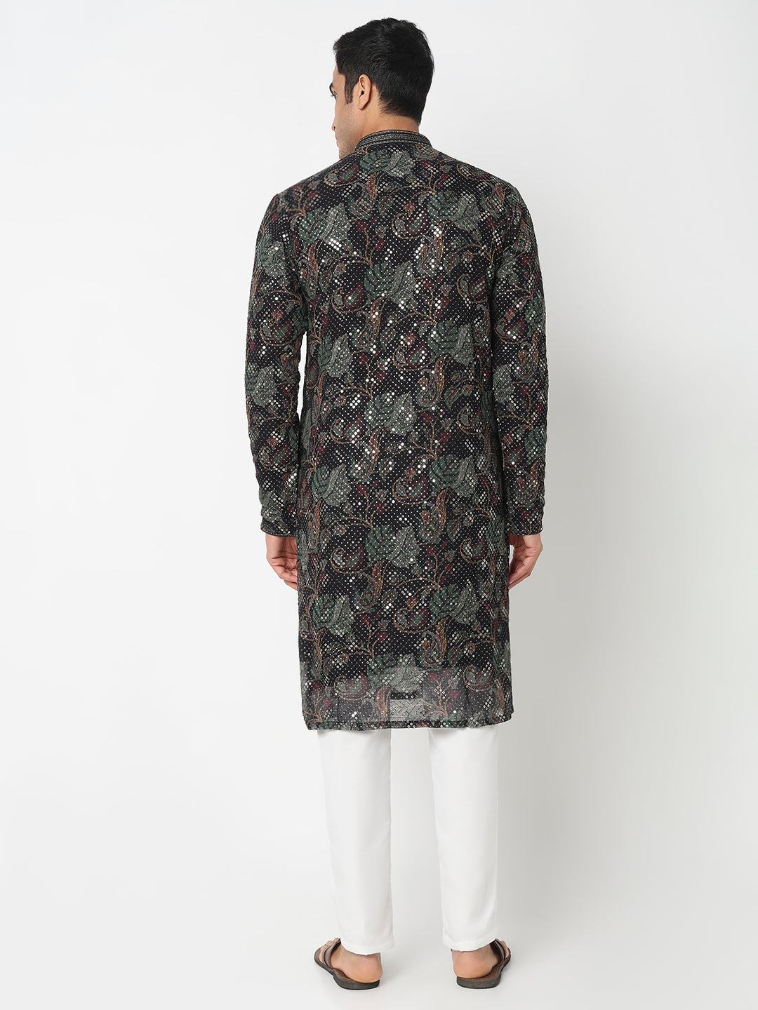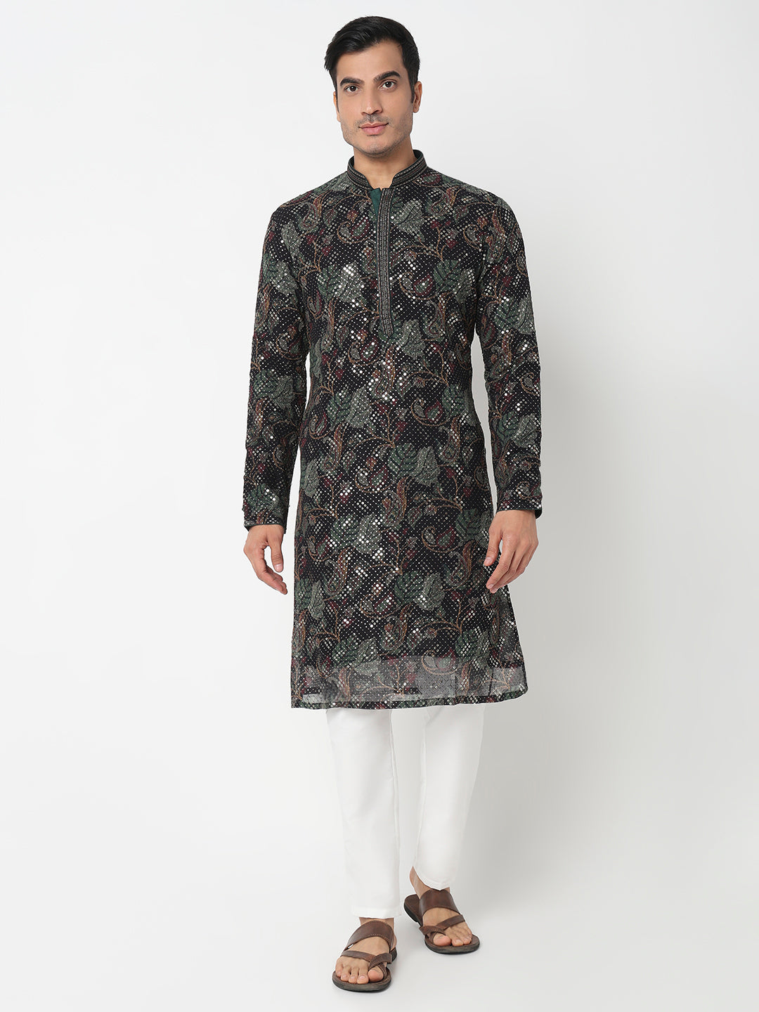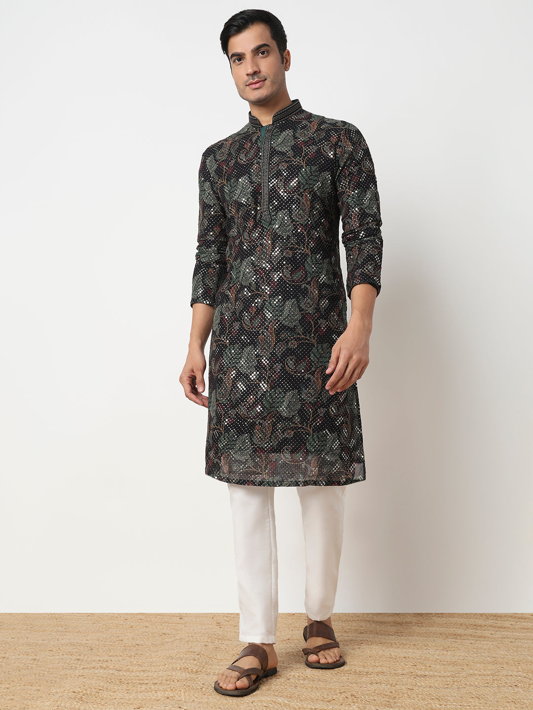 This embroidered pattern kurta with pant set has a mandarin collar and full sleeve. Made from georgette, it is soft and comfortable to wear.