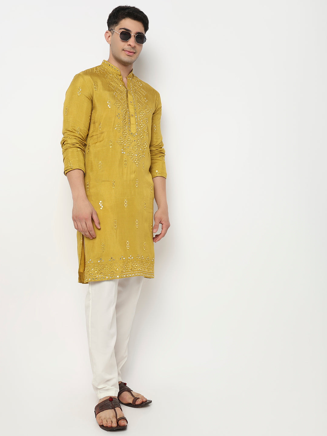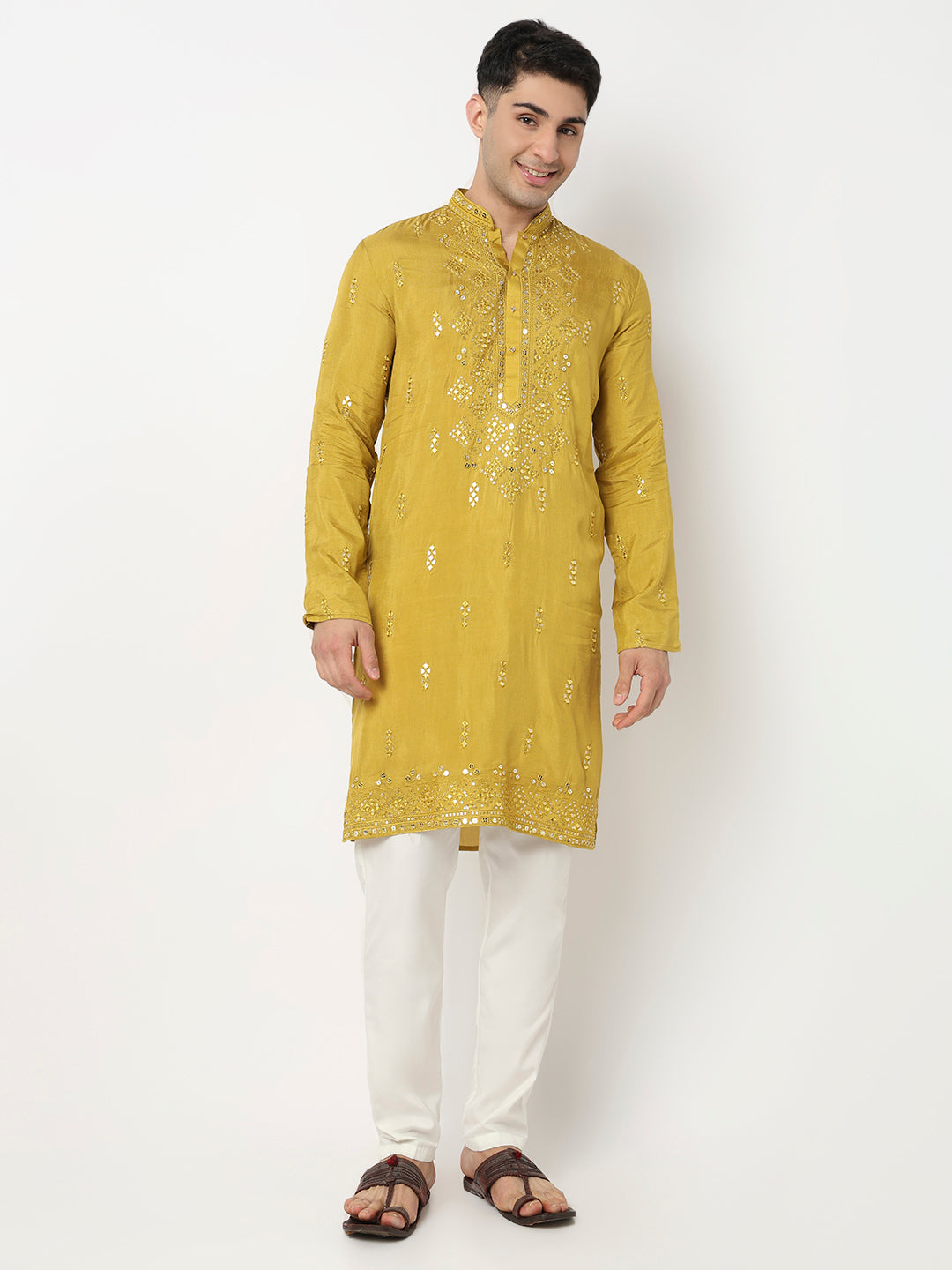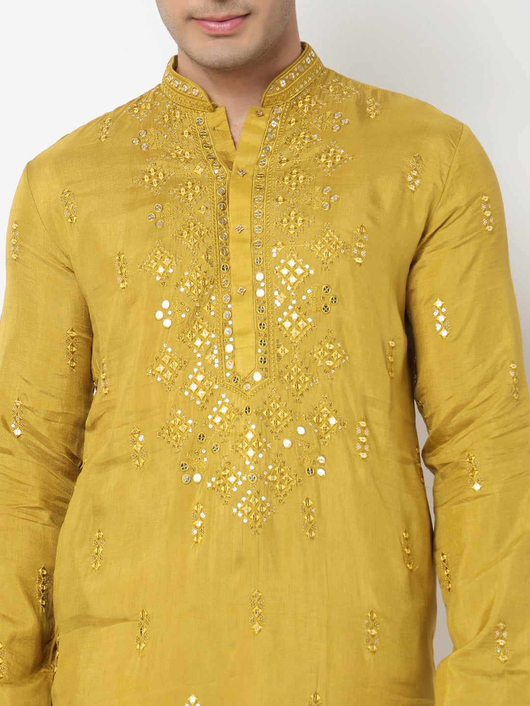 This mirror pattern kurta with pant set has a mandarin collar and full sleeve. Made from viscose, it is soft and comfortable to wear.