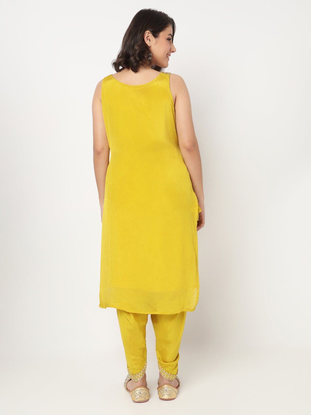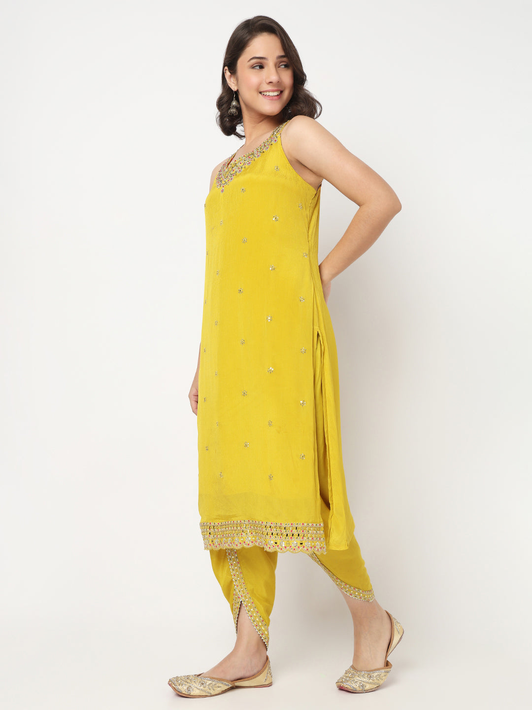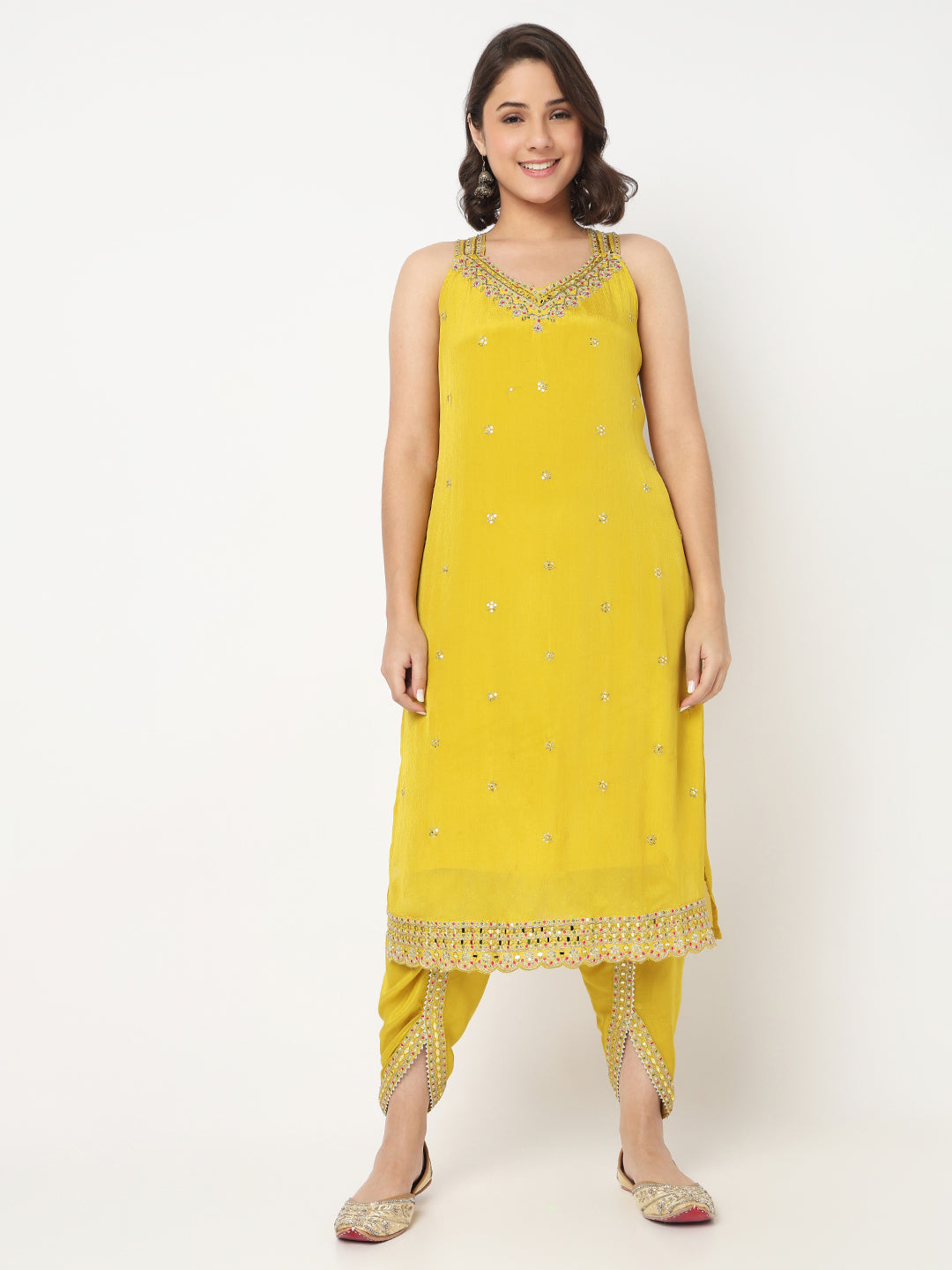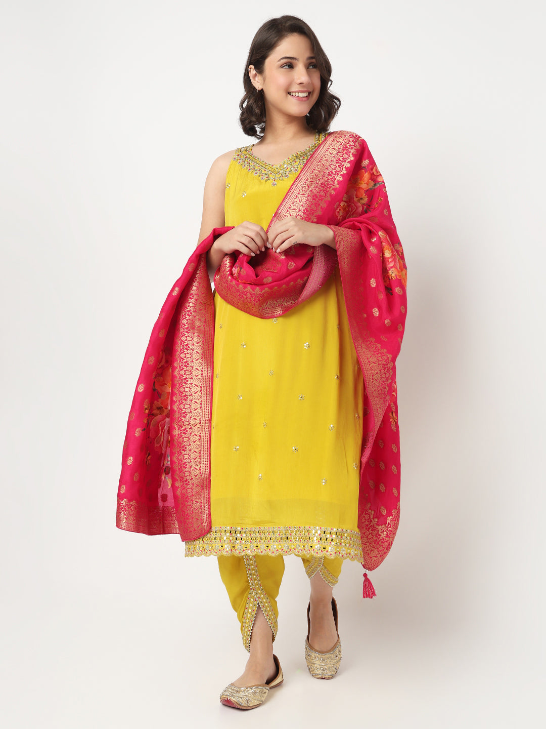 This embroidered pattern kurta and pant with dupatta set has a v-neck and sleeveless with detachable sleeves. Made from chinon, it is soft and comfortable to wear.