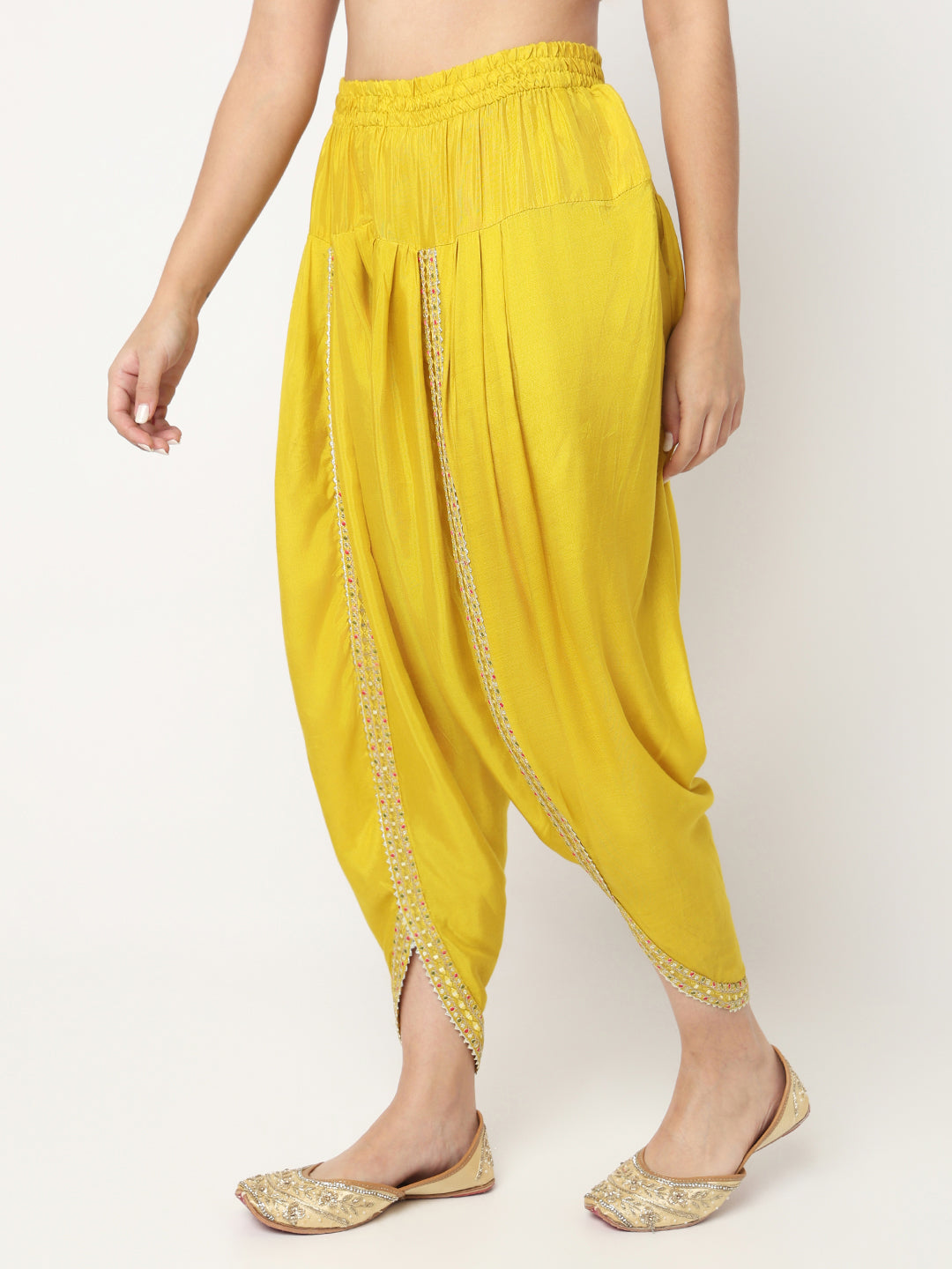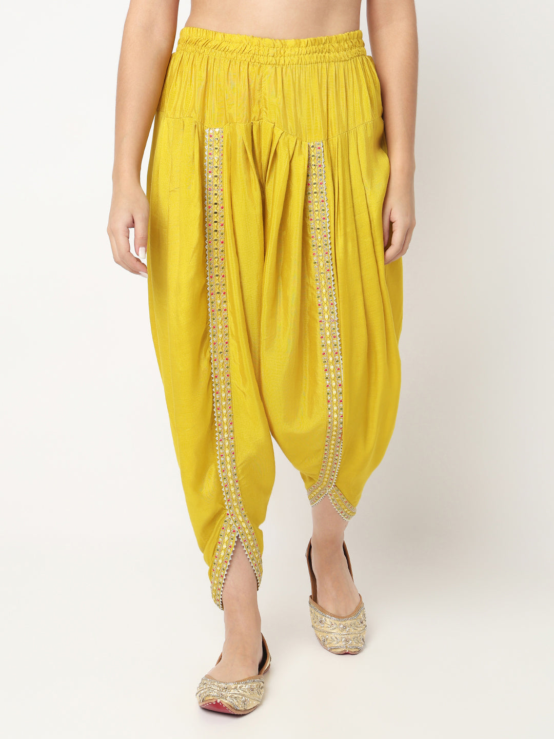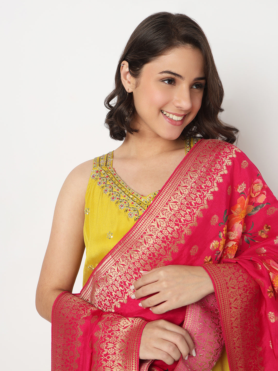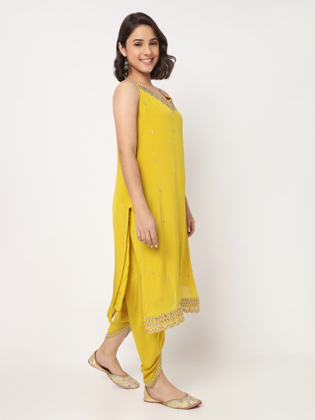 This embroidered pattern kurta and pant with dupatta set has a v-neck and sleeveless with detachable sleeves. Made from chinon, it is soft and comfortable to wear.