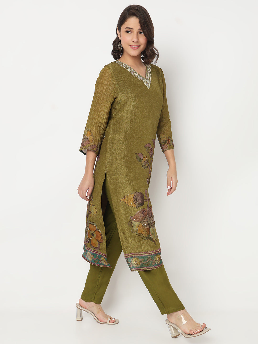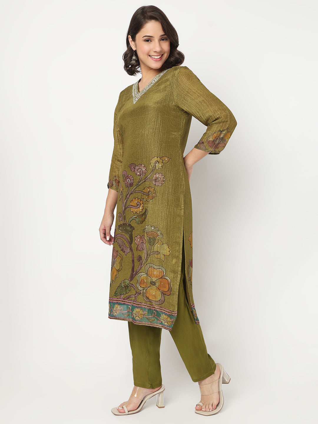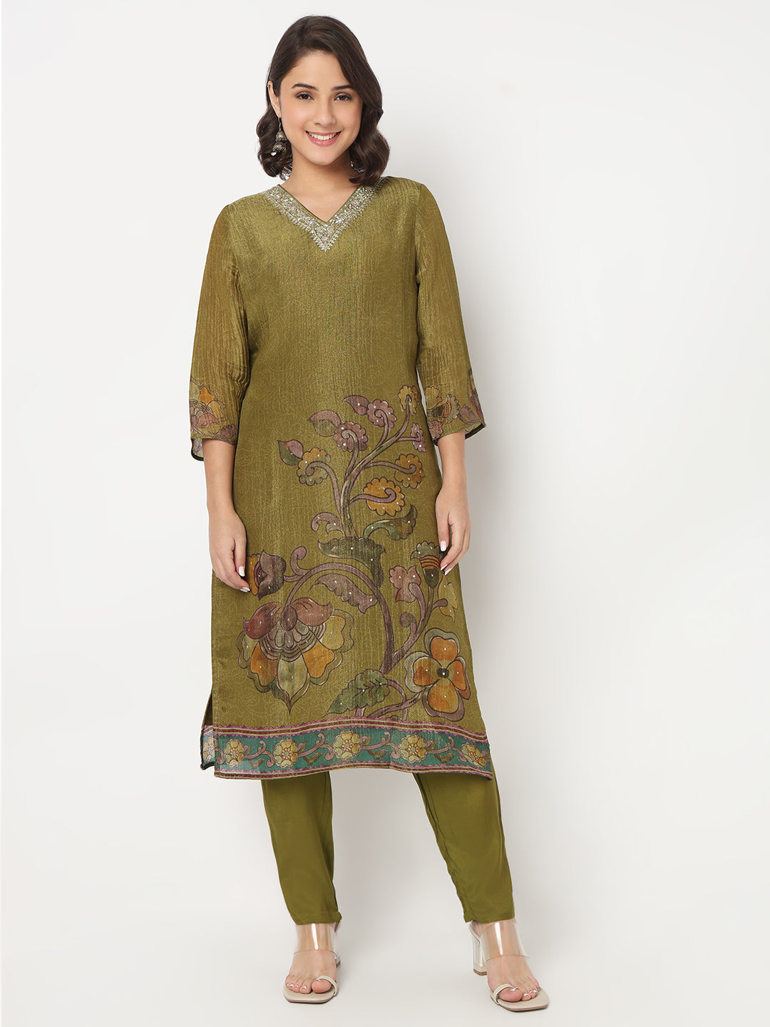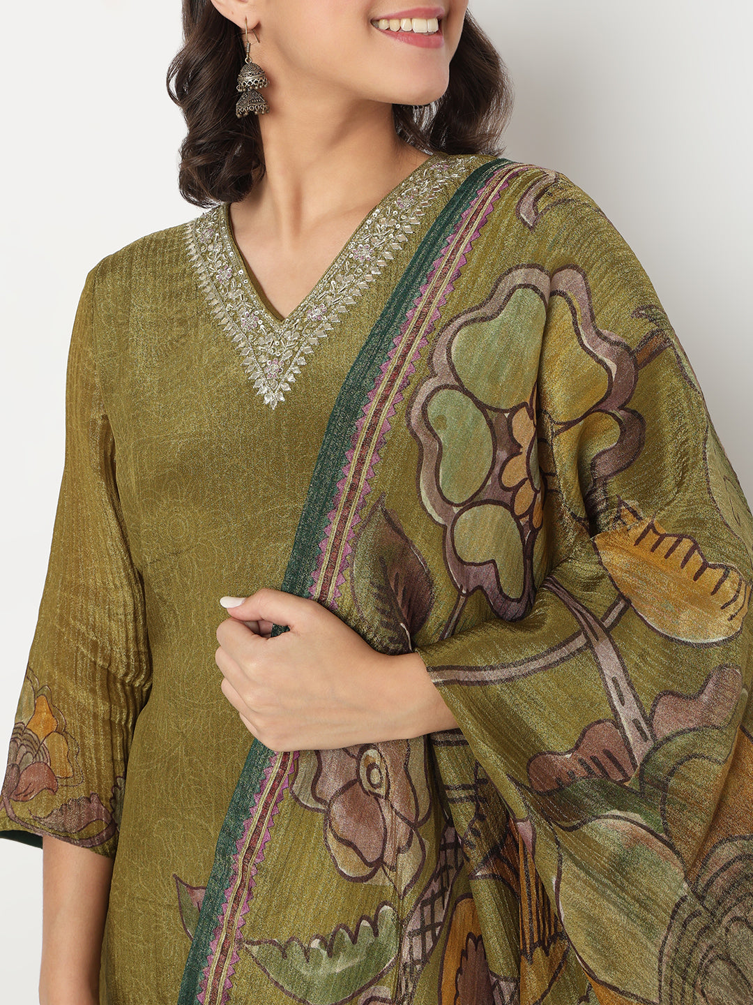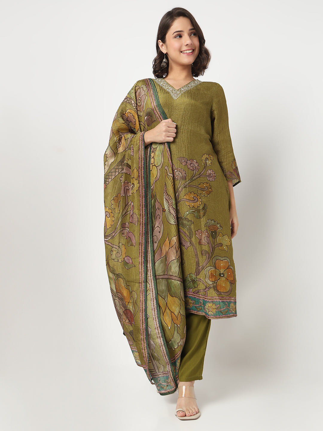 V-Neck Printed Straight Kurta and Pant with Dupatta Set